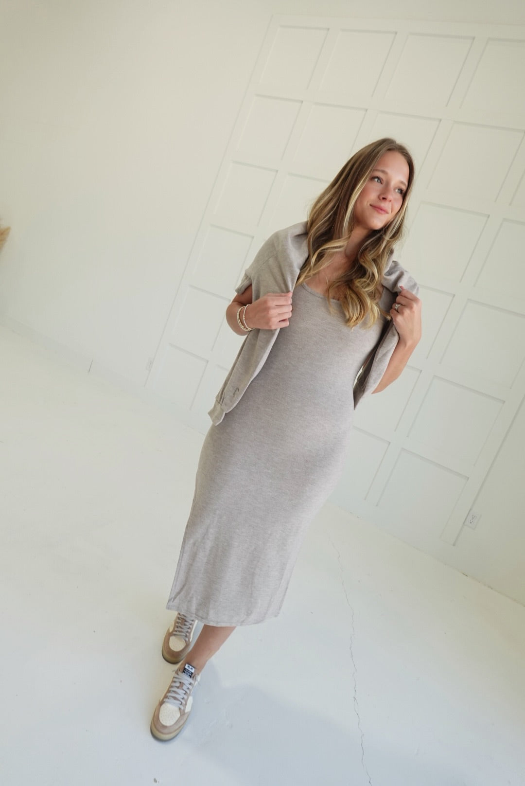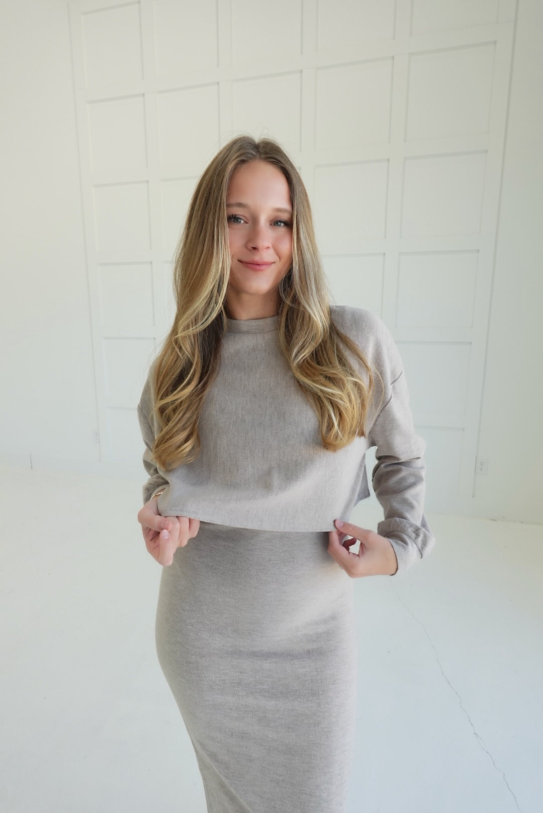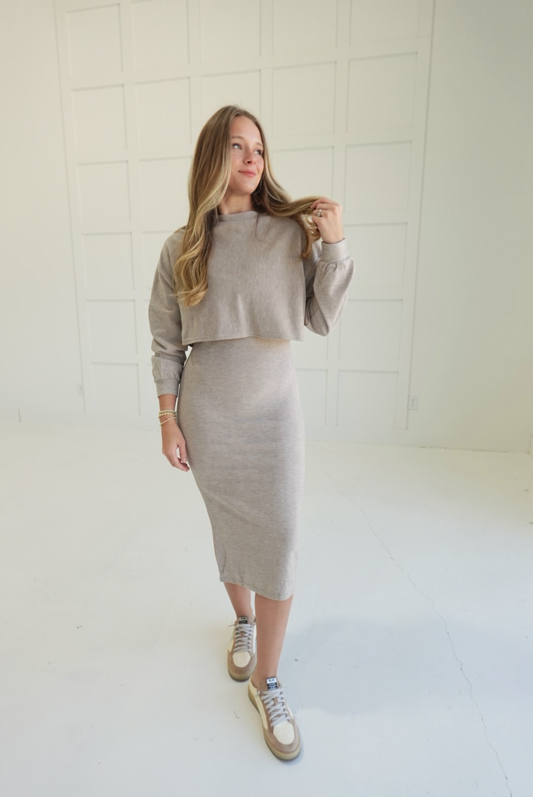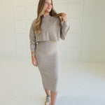 The Spare The Details Set combines a comfortable knit pullover with a versatile midi dress, offering effortless style and cozy layering. Perfect for transitional weather, this set allows you to mix and match for multiple looks while staying warm and polished throughout your day.