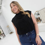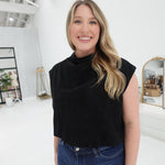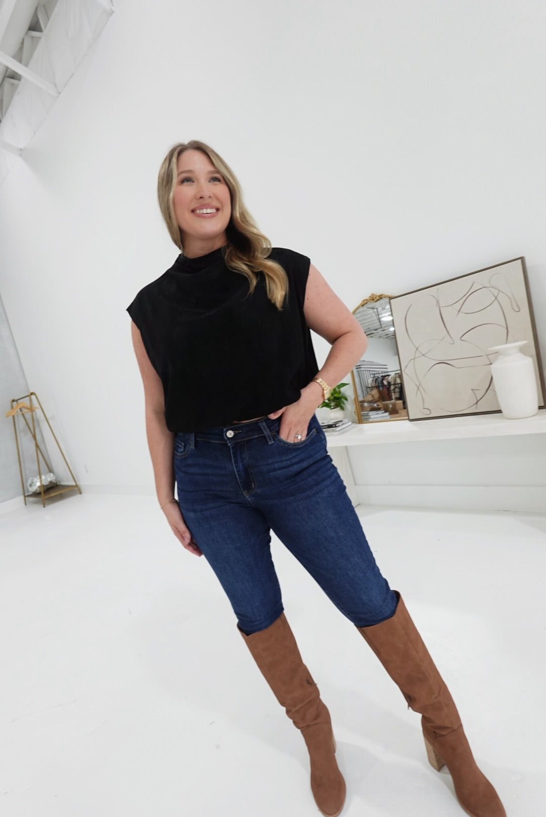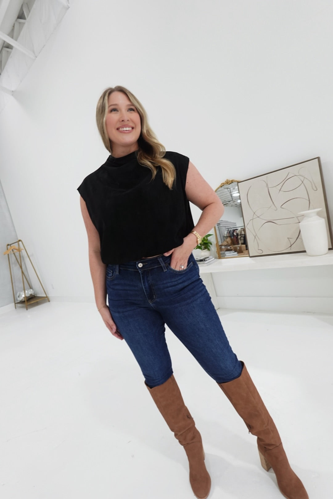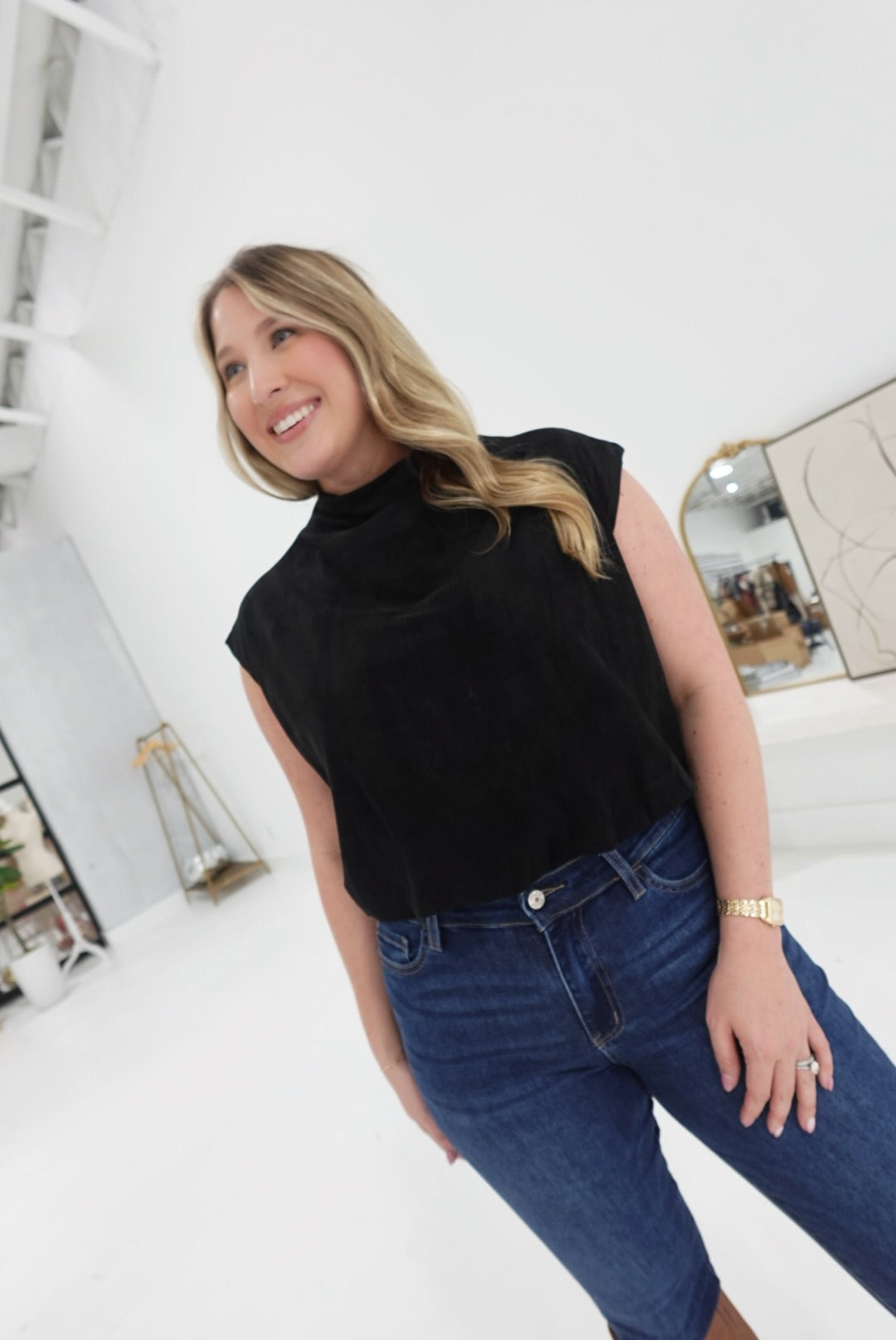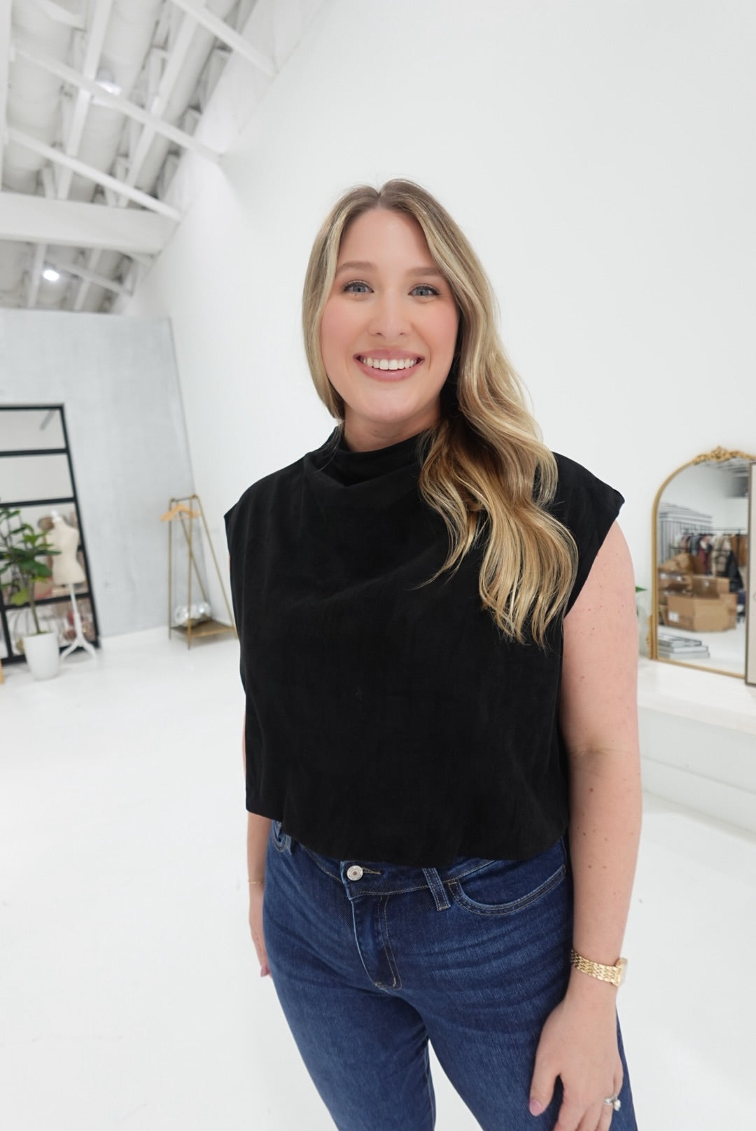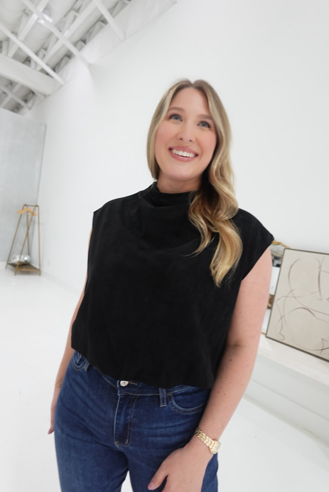 The Splurge Balloon Top in black features a soft suede mock drape neck that adds subtle elegance and comfort to your look. Its unique design offers a flattering silhouette with gentle volume, perfect for both casual and dressy occasions. This top easily pairs with your favorite bottoms, bringing effortless style and confidence to your wardrobe.