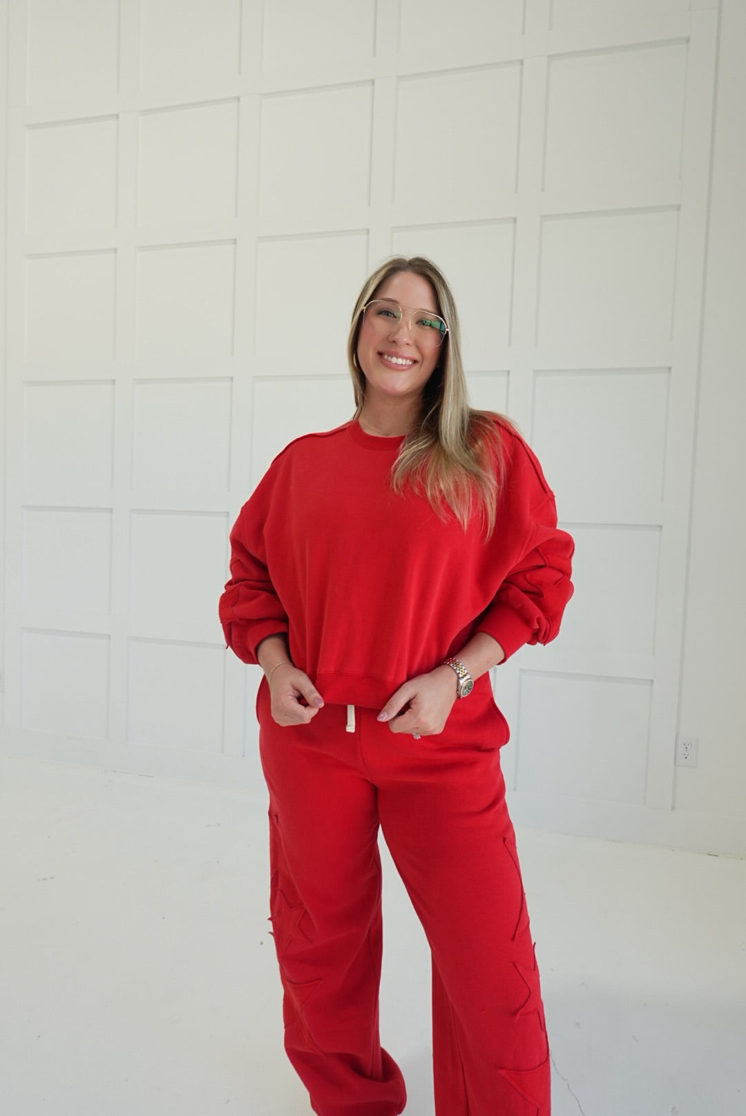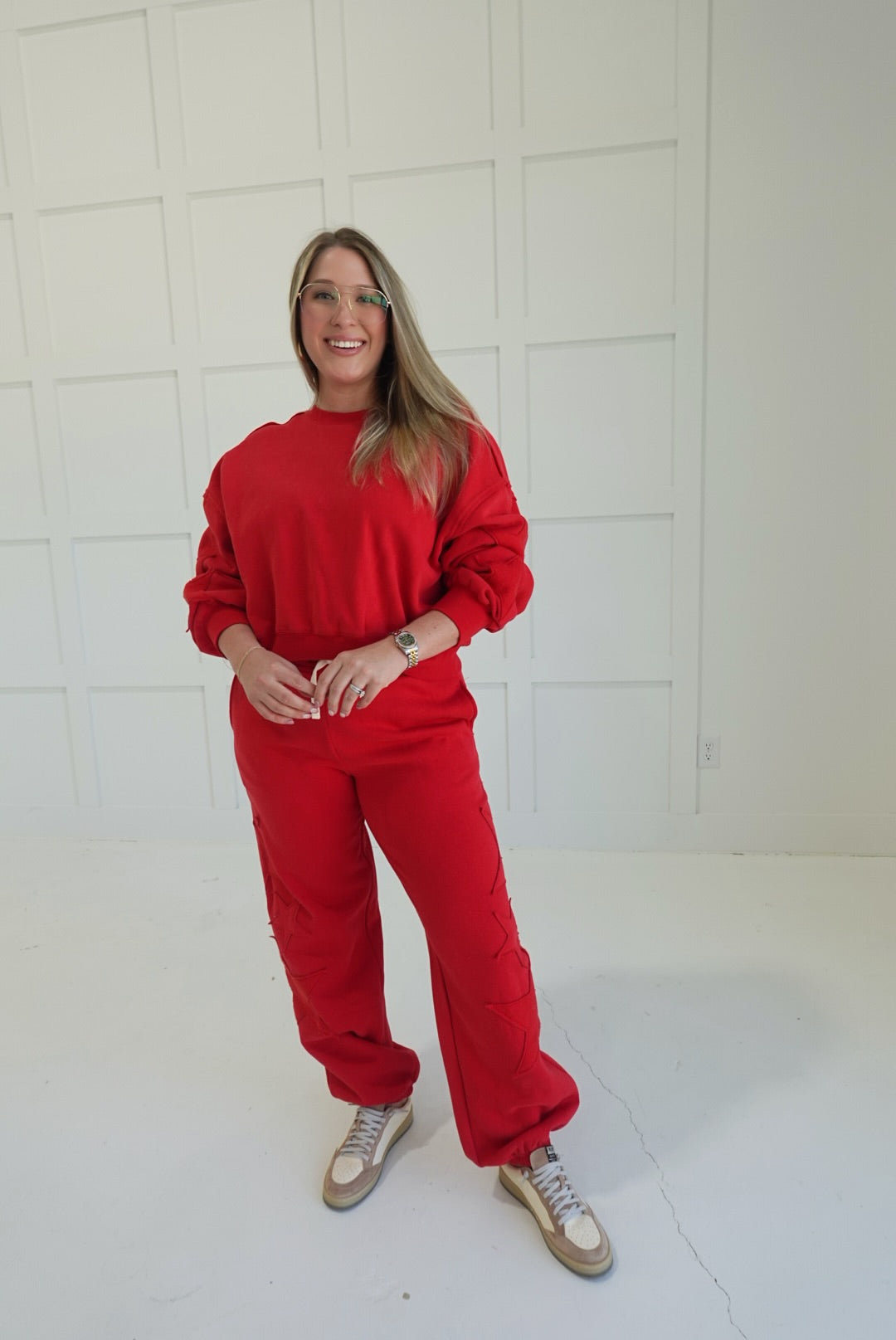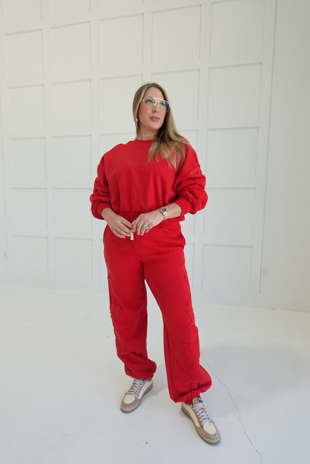Experience ultimate comfort with the Stars Above Lounge Set. This cozy pullover sweatshirt features a charming star patch, paired with matching elastic-bottom sweatpants designed for a relaxed, baggy fit. Perfect for lounging or casual outings, this set offers softness and ease of movement to keep you comfortable all day long. Embrace laid-back style without sacrificing comfort.