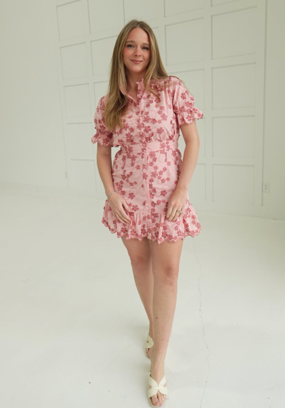 Elevate your everyday style with the Stella Mini Dress, featuring a flattering stand collar and playful ruffled hem. This short-sleeve design offers a modern silhouette perfect for casual outings or dressed-up occasions. The structured collar adds polish while the ruffled hem brings movement and visual interest. A versatile piece that transitions seamlessly from day to night.
