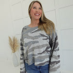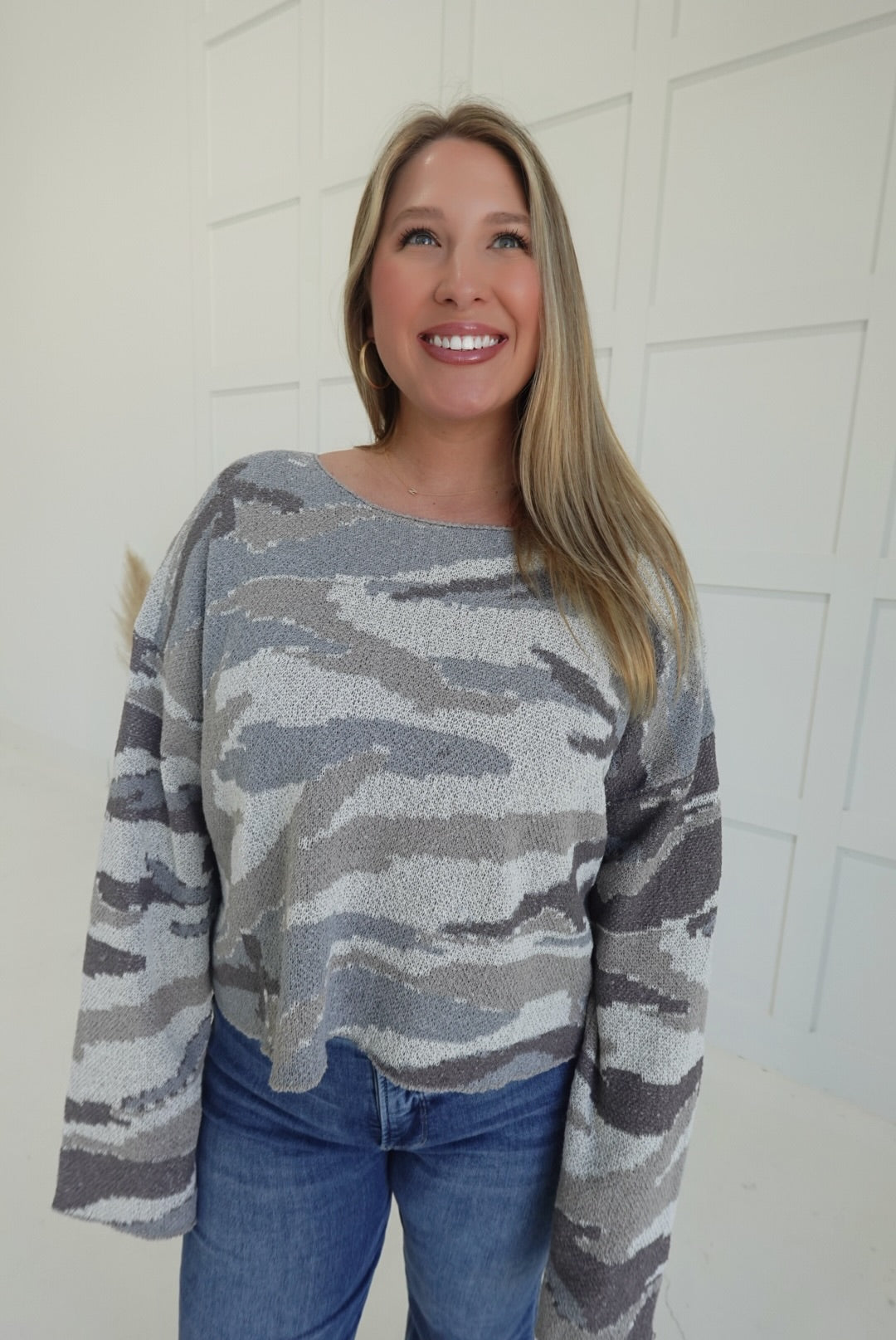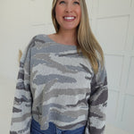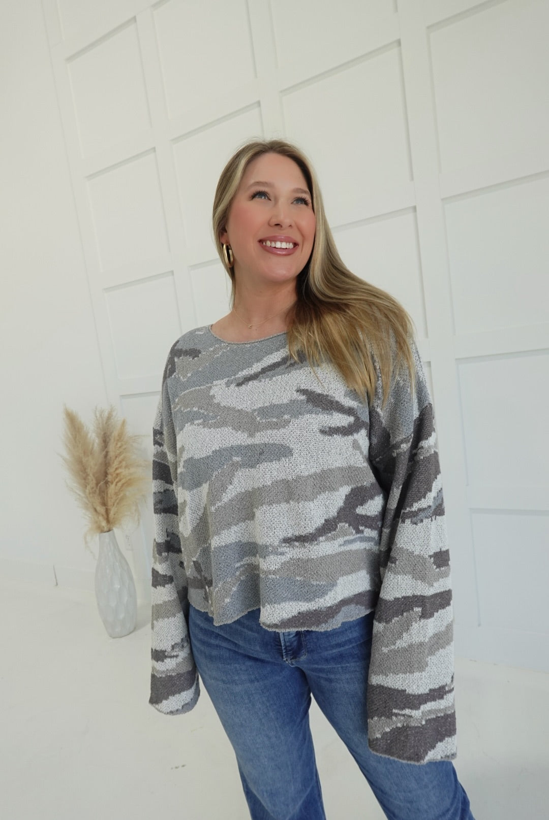 Stay comfortable and stylish with the Sterling Camo Sweater Top. This lightweight sweater features a trendy camo pattern and a flattering boat neck design. Its boxy fit offers a relaxed silhouette, making it easy to layer or wear on its own. Perfect for casual days when you want to feel cozy without extra bulk.