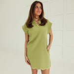 Sully Scalloped Dress - Sage Dare to turn heads in this striking sage mini dress, where delicate scalloped detailing frames a flattering V-neckline. The refined scallop edging adds unexpected texture and movement, while the mini cut delivers bold confidence. Perfect for nights when you want to make a statement without saying a word. Effortlessly chic, undeniably daring.