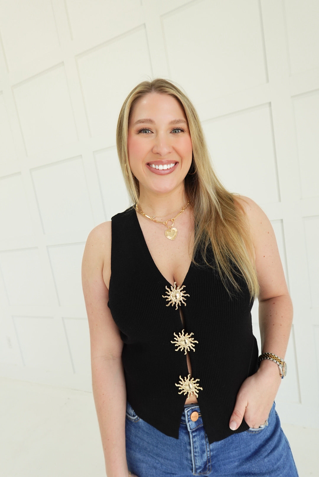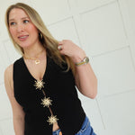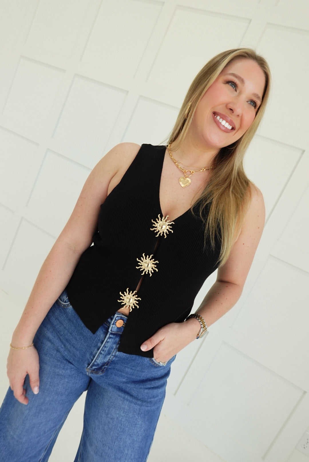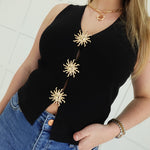 Sleek and commanding, this black sleeveless top cuts a striking silhouette with a plunging V neckline that demands attention. Gold trim accents trace the neckline and armholes, adding a touch of luxury and edge. Perfect for layering over basics or wearing solo as a bold statement piece. Versatile enough for evening wear or elevated casual looks, this top transforms any outfit into something unforgettable.