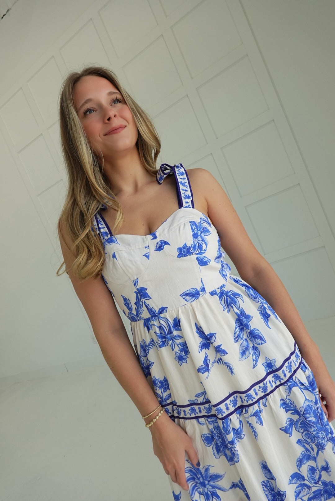 The Sweet Caroline Midi Dress offers a flattering fit with its smocked back and adjustable shoulder tie bustier. Crafted from lightweight woven fabric, this lined dress features a charming floral print and a stylish border accent. Practical side pockets add convenience, while the non-sheer material ensures comfortable coverage for all-day wear.