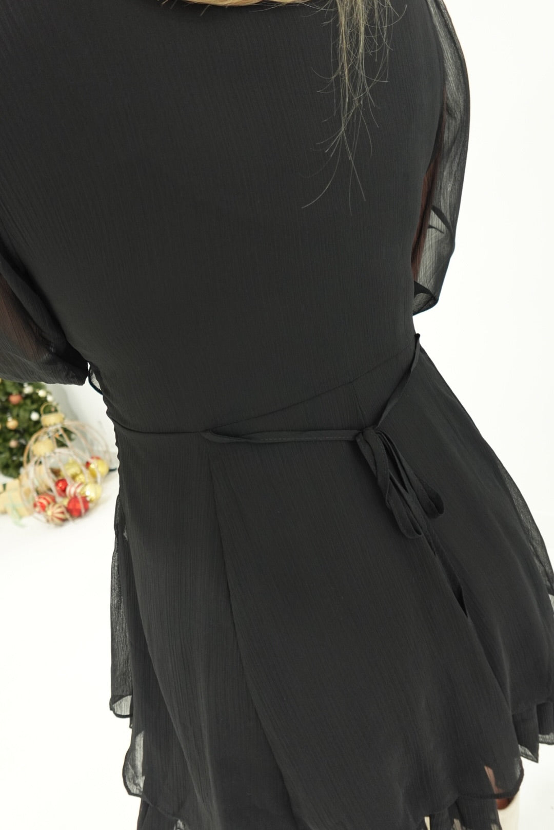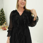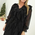 Twirl with confidence in this charming tie-front ruffled mini dress. The playful ruffled details and adjustable tie front create a flattering silhouette that moves with you, while the mini length keeps things fresh and fun. Perfect for date nights, casual outings, or whenever you want to feel effortlessly put-together. The classic black hue pairs easily with your favorite accessories, making it a versatile piece you'll reach for again and again.