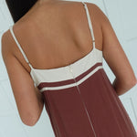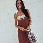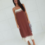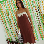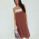 The Sybil Colorblock Dress combines comfort and style with its loose-fitting silhouette. Featuring adjustable cami straps and a flattering square neckline, this midi-length dress showcases beautiful contrasting sienna and taupe colorblocking. Side slits add movement and versatility to this effortlessly chic piece, perfect for both casual outings and dressed-up occasions.