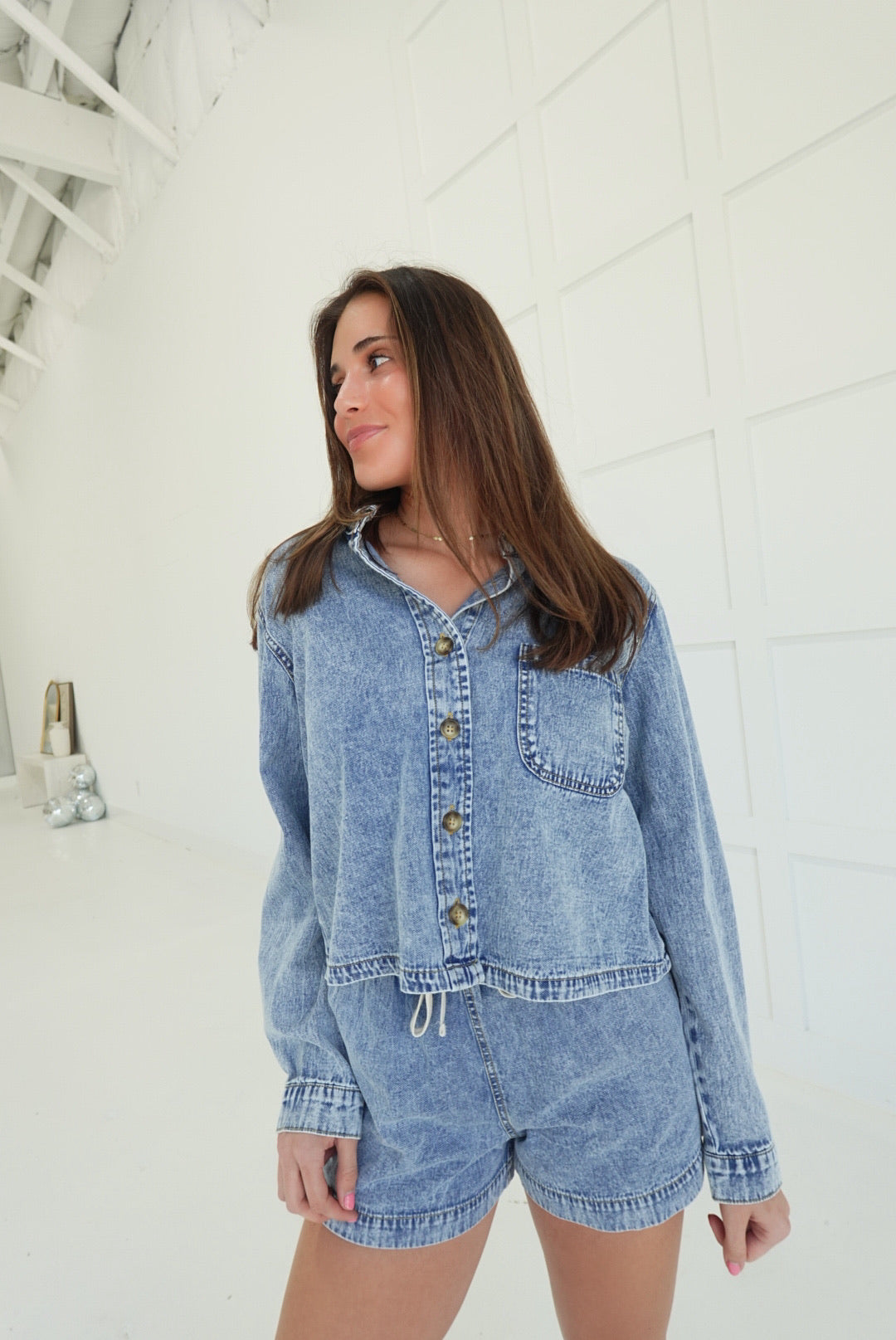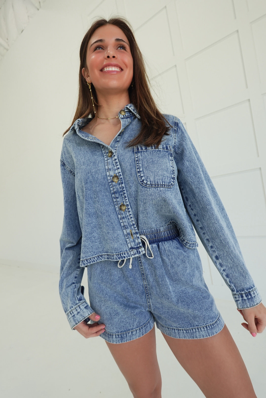 - Button Up Shirt + Drawstring Denim Shorts