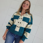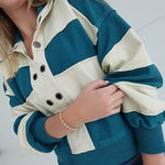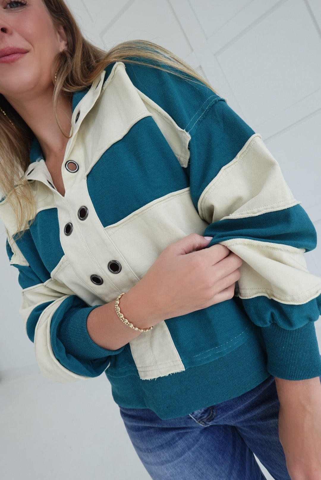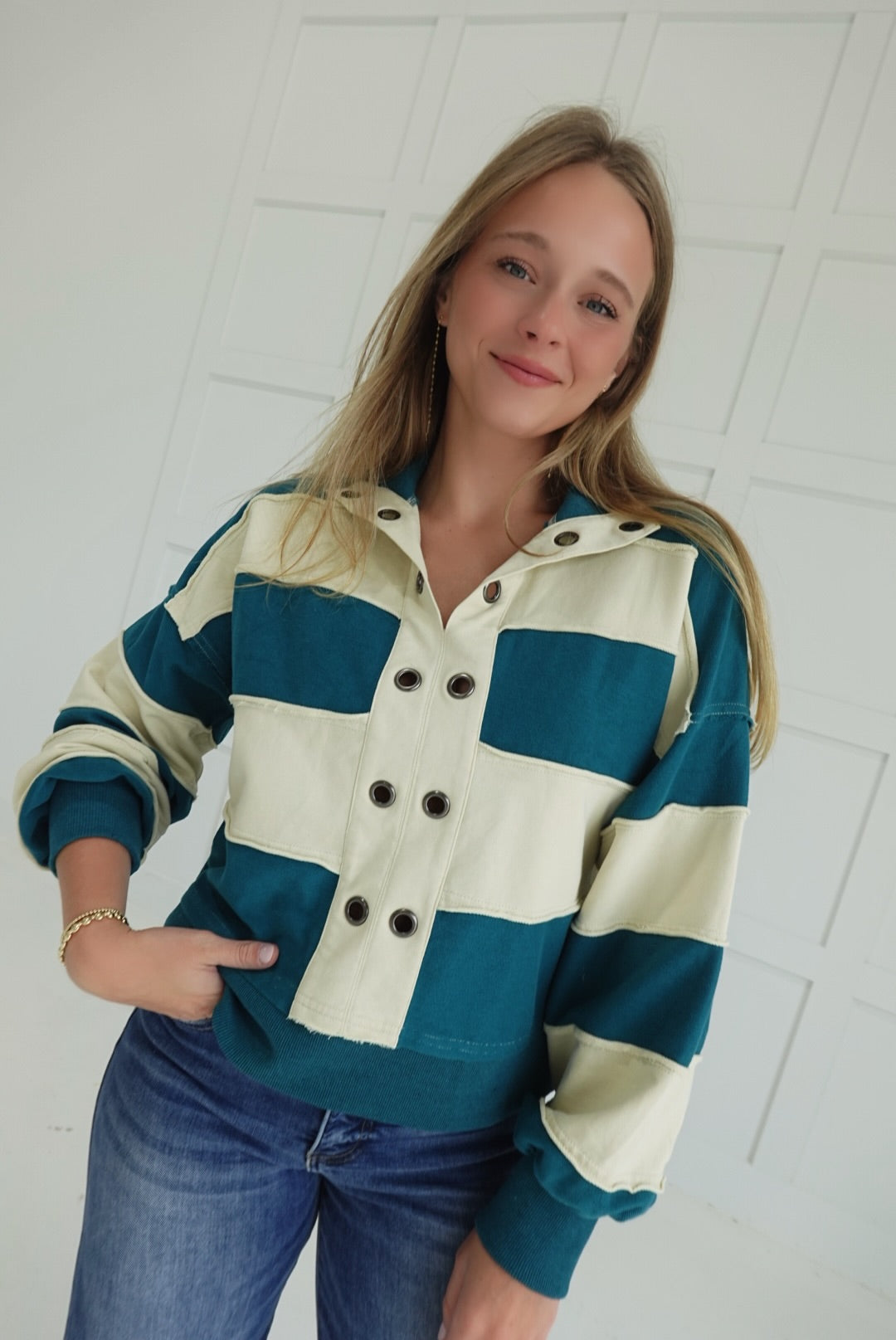 The Tamara Pullover combines a unique striped texture with a classic rugby style, enhanced by distinctive grommet details. This sweatshirt offers a comfortable fit while adding a stylish edge to your casual wardrobe. Perfect for layering or wearing on its own, it supports your everyday look with both comfort and character.