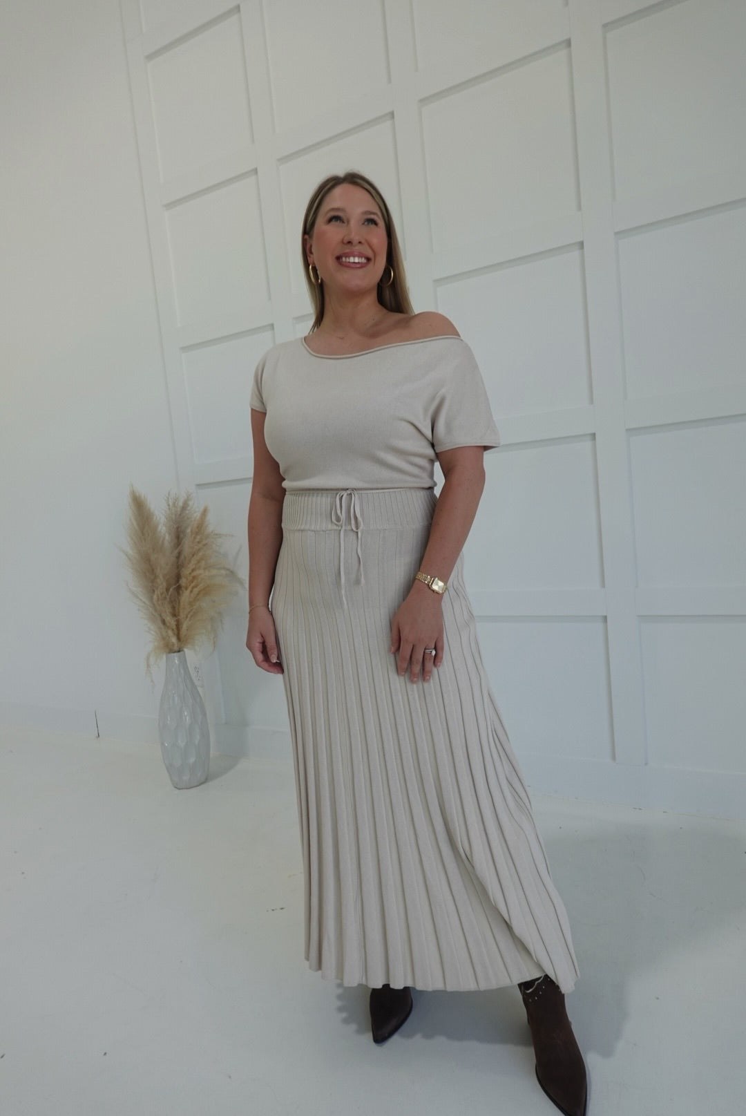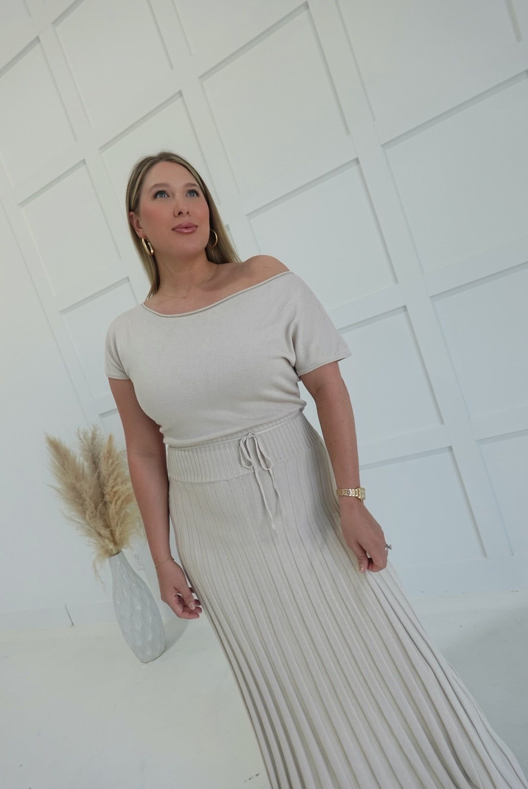 This Taupe This Moment Midi Dress features a beautiful knit fabric with elegant pleats that flow gracefully. The off-the-shoulder design adds a flattering and feminine touch, perfect for making a subtle statement. Comfortable and stylish, this dress is ideal for occasions where you want to feel both confident and relaxed. Its versatile midi length ensures it suits a variety of settings, from casual outings to special events.