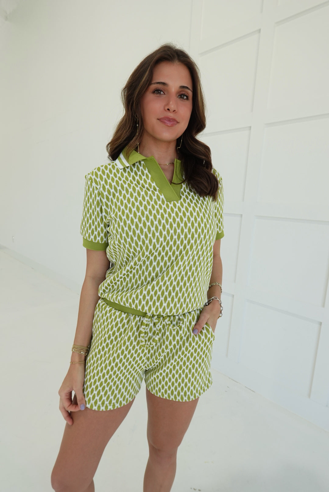 - Elastic Waist Shorts + V Neck Polo Top