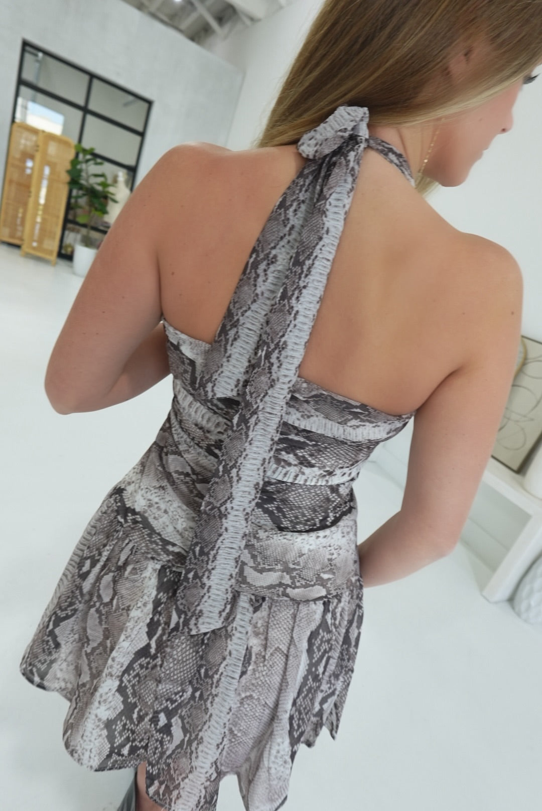 This Temptations Mini Dress features a flattering halter neck and delicate ruffle details that add a touch of feminine charm. The drop-waisted silhouette creates a graceful flow, enhancing comfort and style, while the mini length offers a playful, confident look. Perfect for warm days or special occasions, this dress combines ease with elegance for a versatile wardrobe staple.