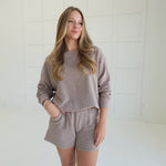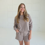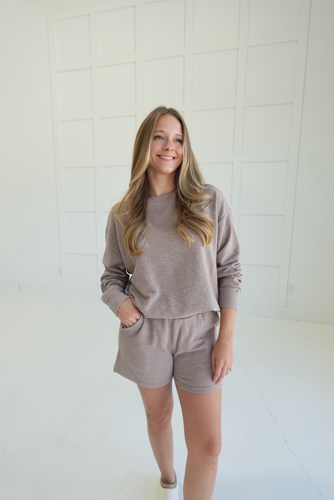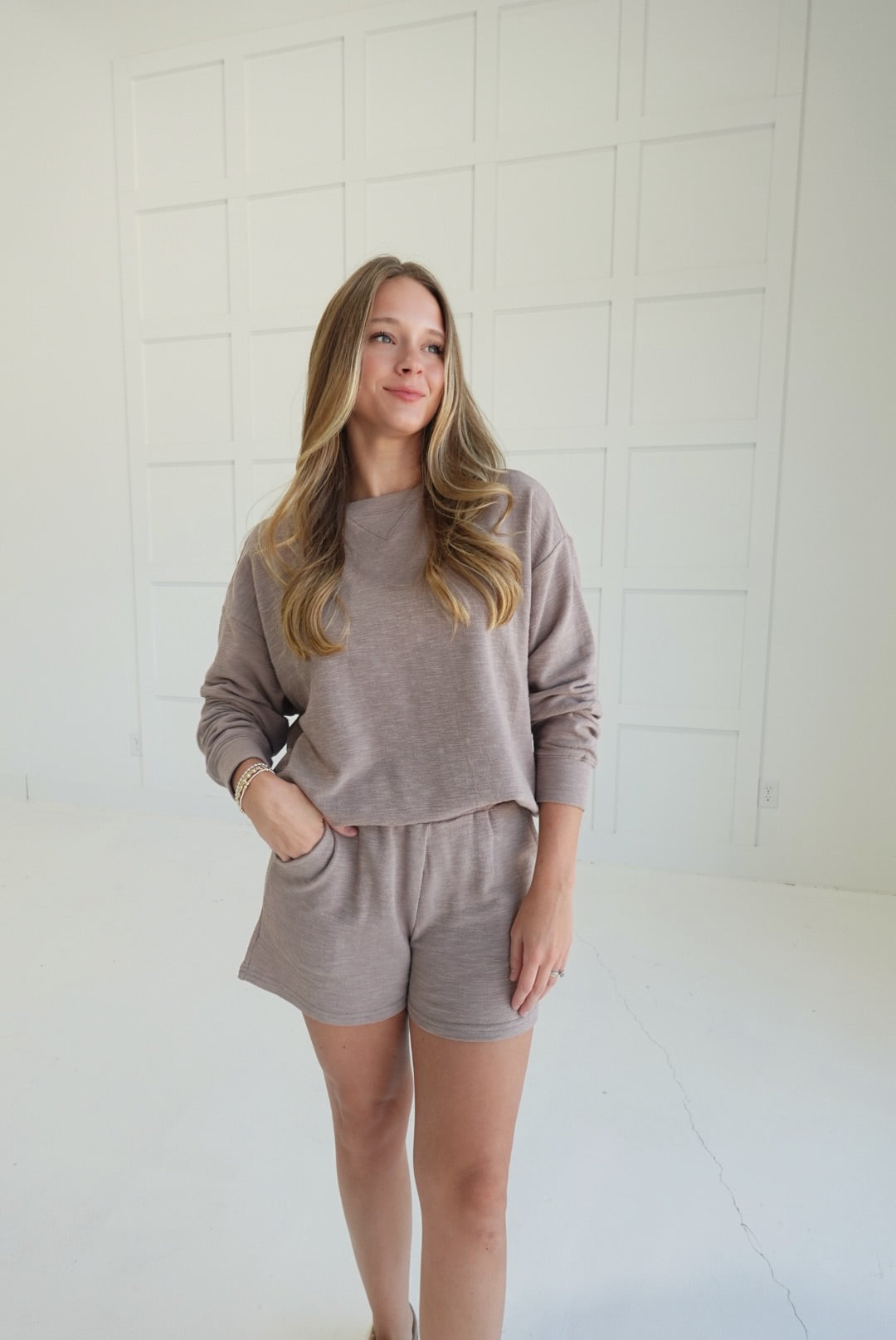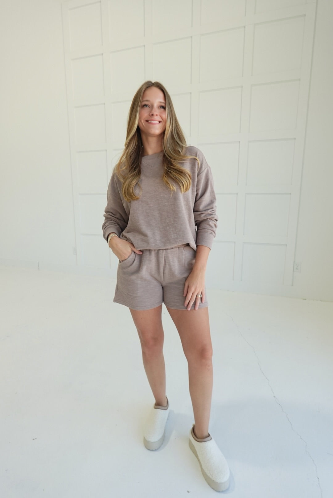 The Downtime Set in Ash Mocha features a soft slub fabric pullover paired with matching shorts, designed for effortless comfort. The long-sleeve pullover offers cozy coverage while the shorts provide breathable ease, making this set ideal for relaxing days at home or casual outings. Its neutral ash mocha shade complements a wide range of styles, supporting your comfort without sacrificing a relaxed, put-together look.