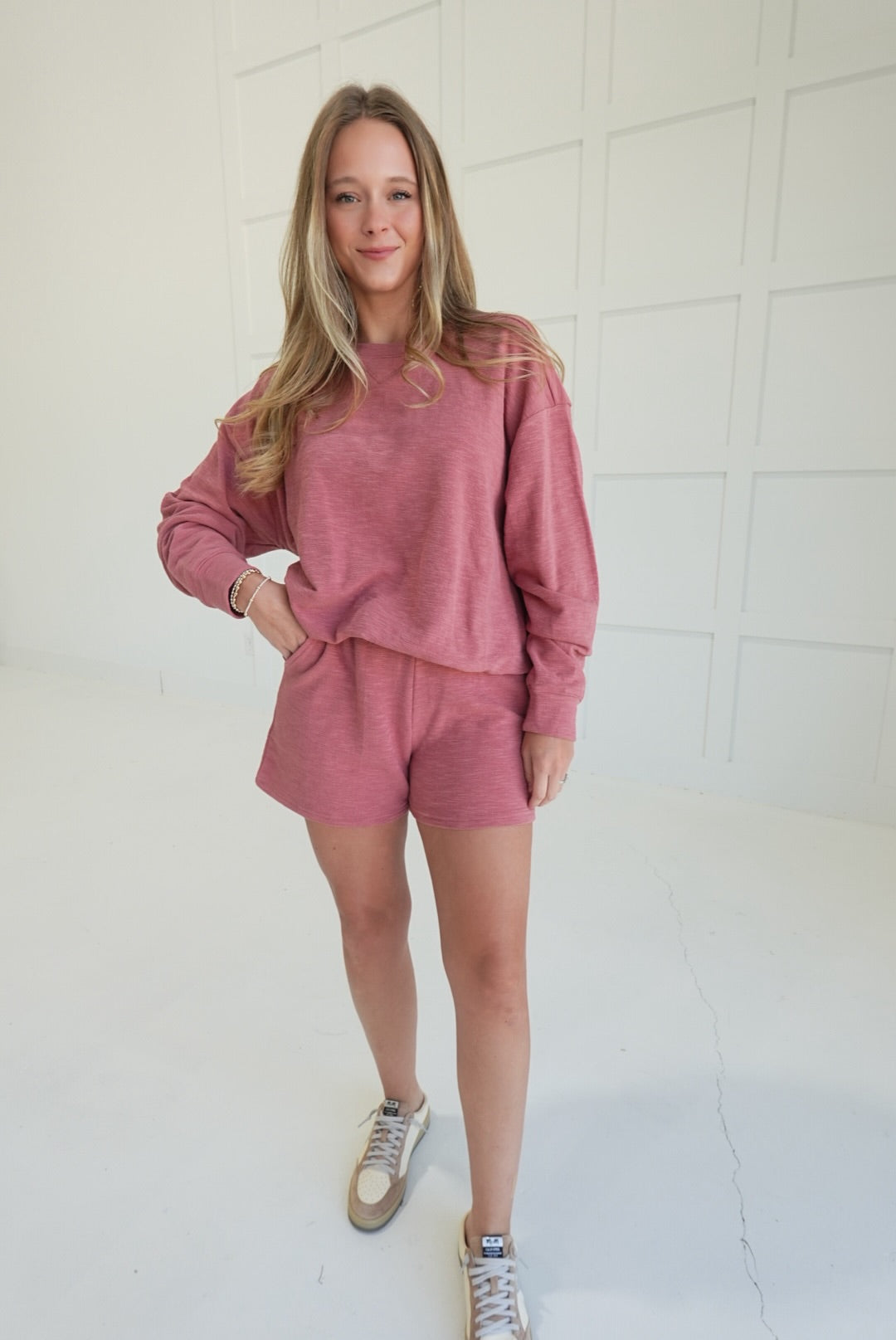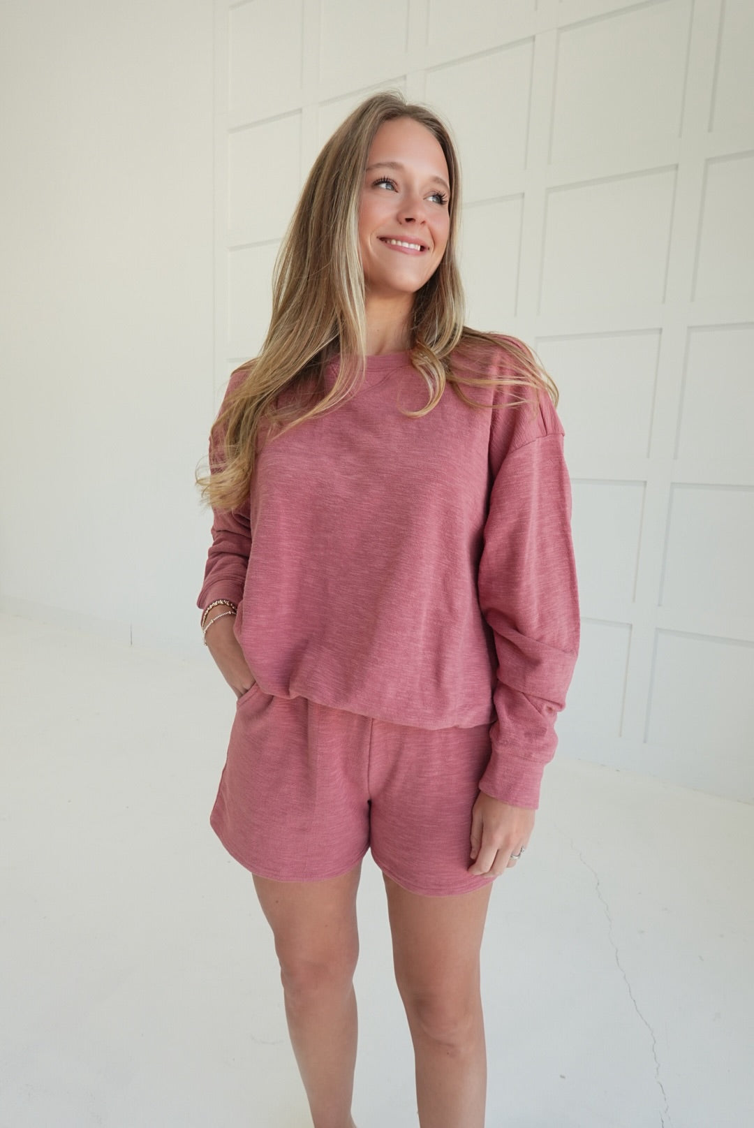 The Downtime Set features a soft slub fabric pullover paired with matching shorts, designed for effortless comfort. The long-sleeve pullover offers cozy coverage while the shorts provide breathable ease, making this set ideal for relaxing days at home or casual outings. Its neutral ash mocha shade complements a wide range of styles, supporting your comfort without sacrificing a relaxed, put-together look.