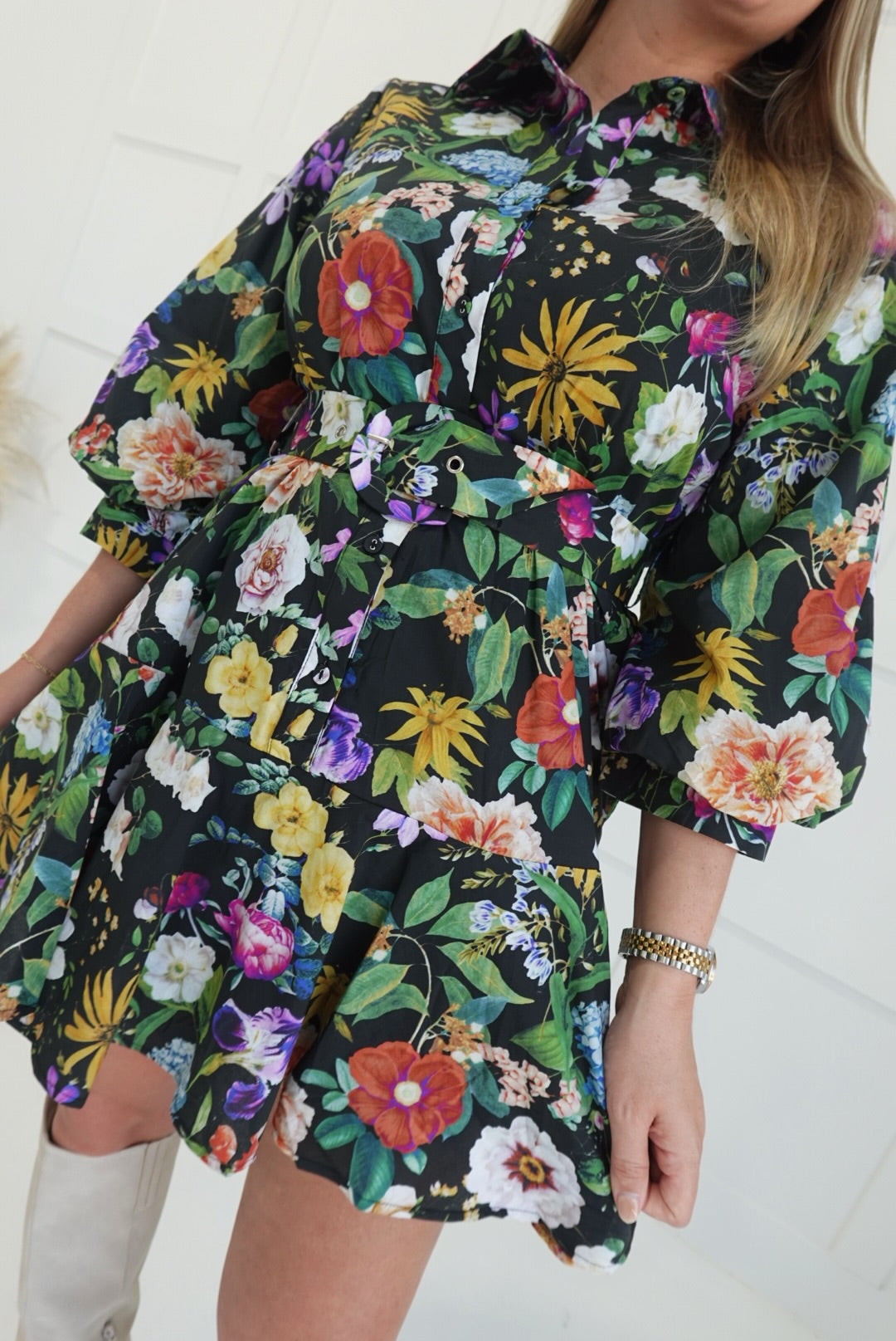 The Founders Mini Dress features elegant 3/4 sleeves and a charming floral button-front design. Its flattering mini length and removable waist belt allow for personalized styling, making it a versatile addition to your wardrobe. Comfortable and stylish, this dress supports your confidence from day to night occasions.