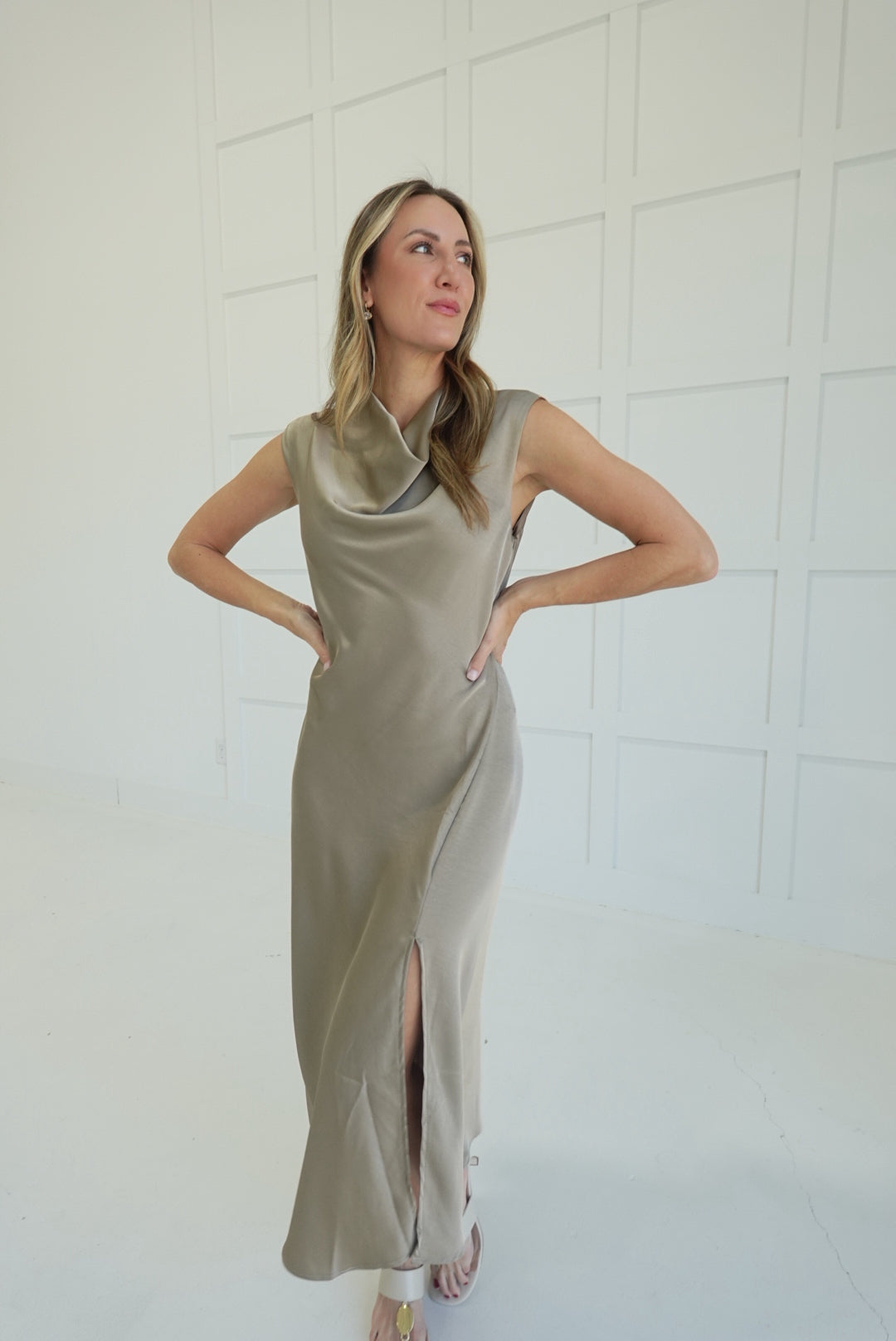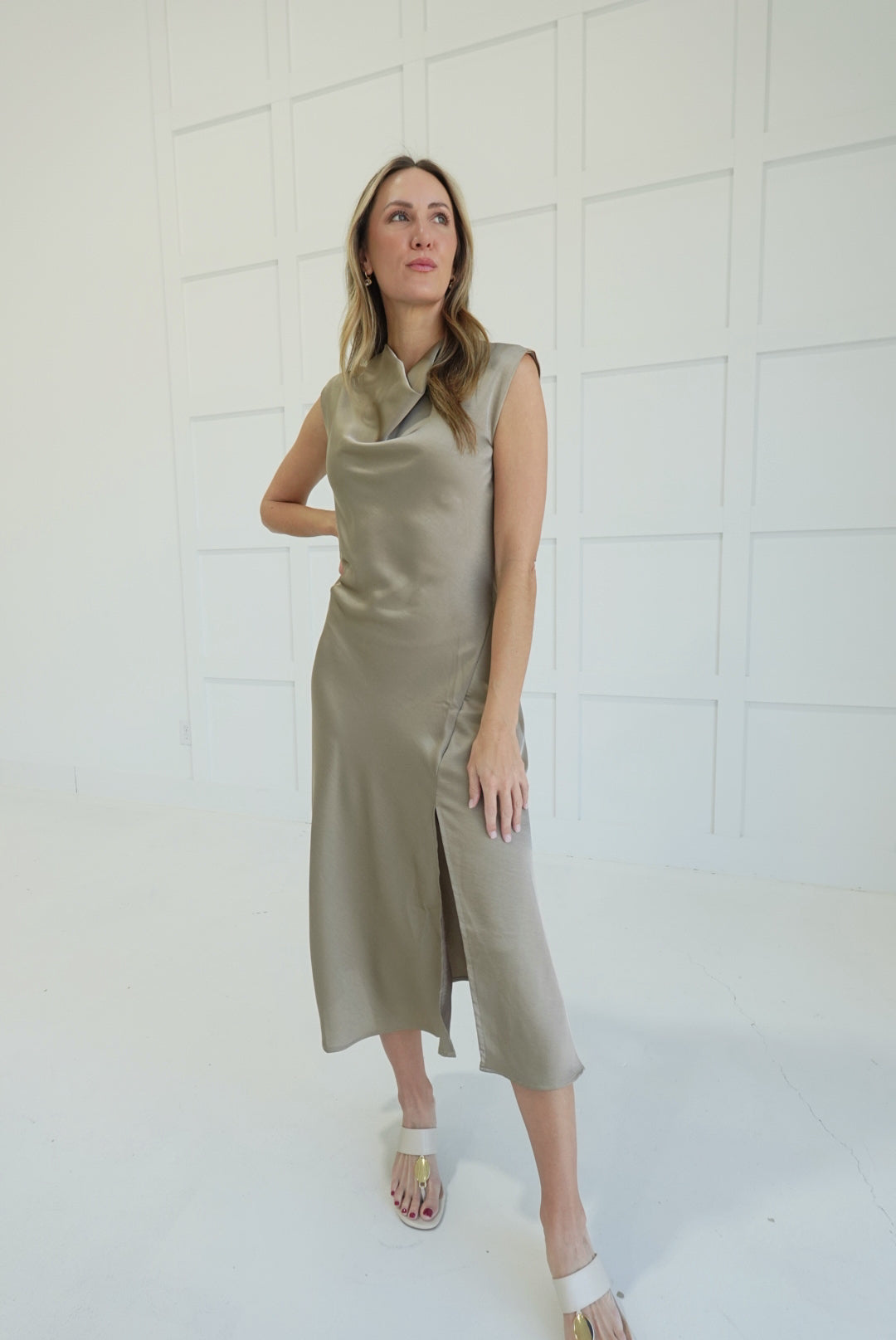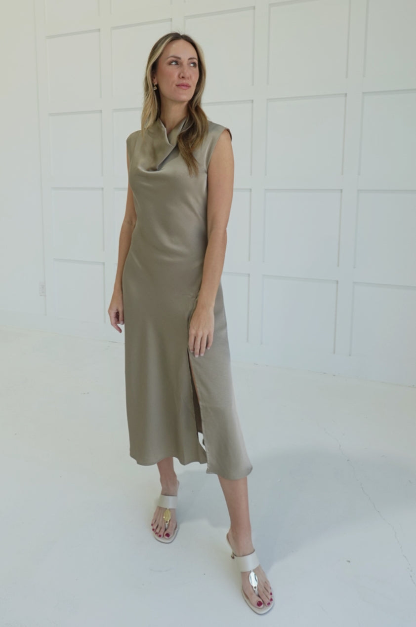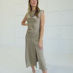 Slip into effortless elegance with this midi dress, designed for those who dare to stand out. The draped cowl neckline creates a sultry silhouette while short sleeves keep the look modern and wearable. Perfect for evening events, date nights, or whenever you want to feel confident and undeniably chic. Smooth fabric flows to a flattering midi length that works for any occasion.