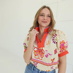 The Ovation Top commands attention with its bold stand collar and intricate boho floral design. This statement piece layers effortlessly over basics or stands alone as your go-to for turning heads. The structured neckline adds edge while the flowing fabric and botanical print deliver that coveted bohemian spirit. Perfect for those who refuse to blend in.
