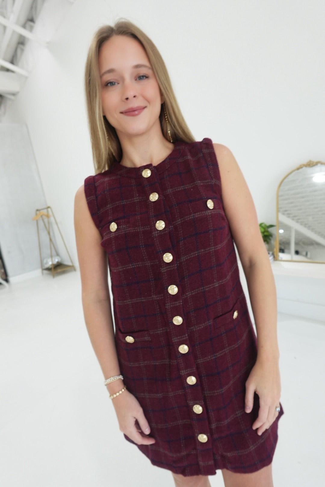 The Oxford Charmer Mini Dress combines classic plaid tweed with a modern sleeveless, button-down design for effortless style. Its mini length offers a youthful and versatile look, perfect for layering or wearing on its own. Crafted to provide both comfort and charm, this dress is ideal for dressing up or down while keeping you confident and stylish.