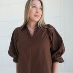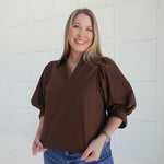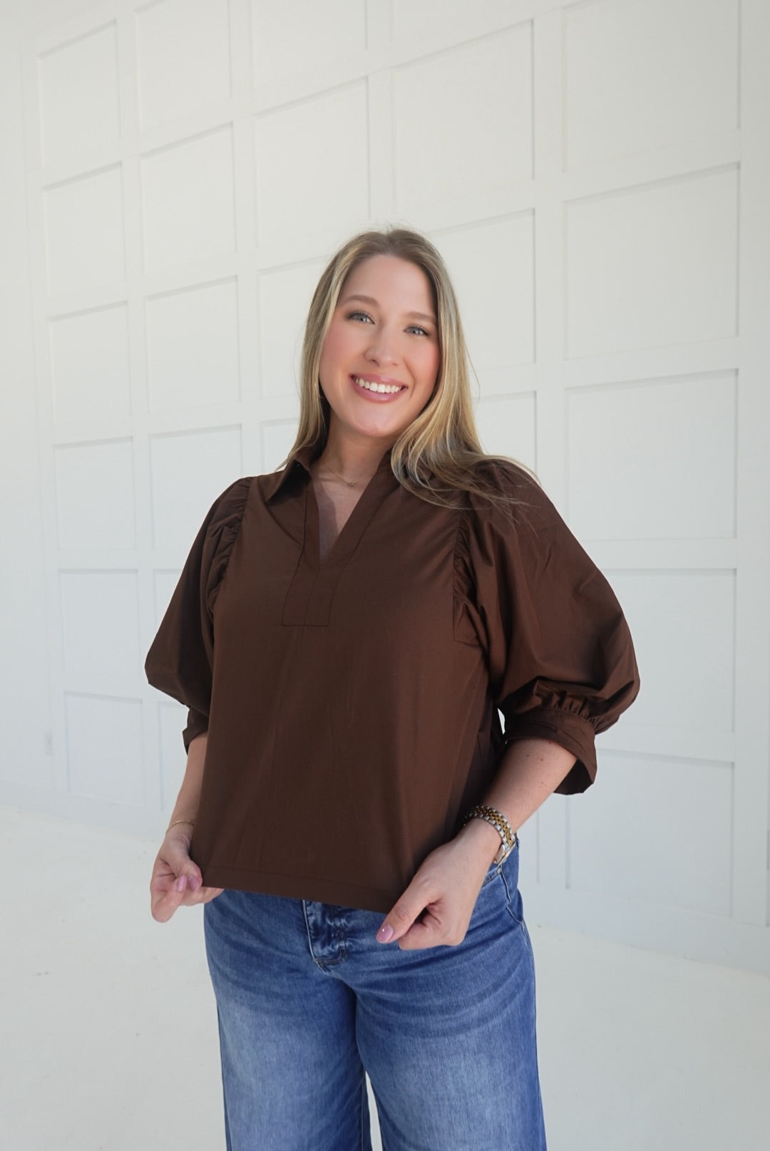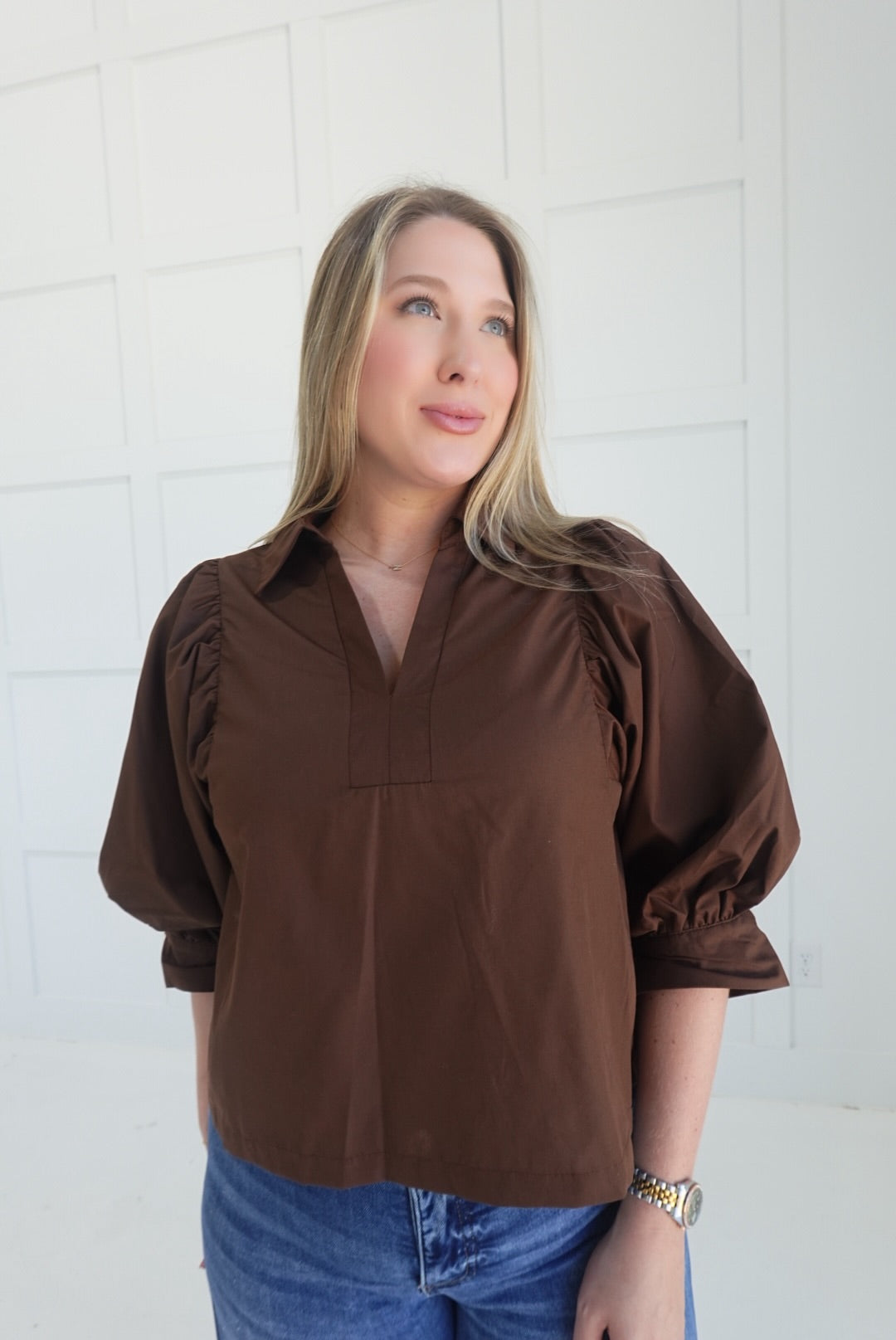 The Perfect Look Top in brown offers a flattering V-neck and elegant pleated shoulder detail that adds a subtle touch of sophistication. Designed with lightweight woven fabric, this non-sheer, unlined top ensures comfortable wear throughout the day. Its 3/4 sleeves provide balanced coverage, making it a versatile choice for both casual and polished looks.