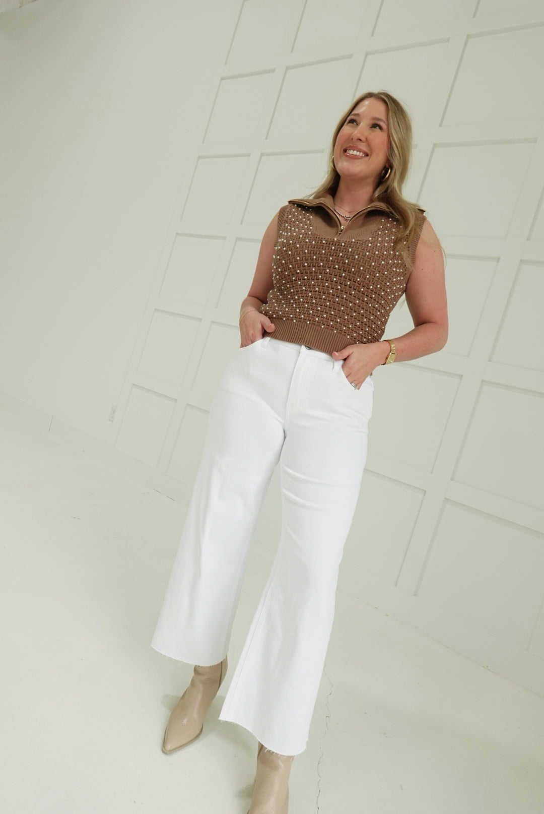 The Perks Cropped Jeans deliver bold, unapologetic style with a crisp white finish and relaxed wide-leg silhouette. The cropped length hits at just the right spot to showcase statement footwear or bare ankles, making them a fearless wardrobe essential. Perfect for those ready to take risks with their denim game—pair with anything from minimalist basics to maximalist accessories and own the room.