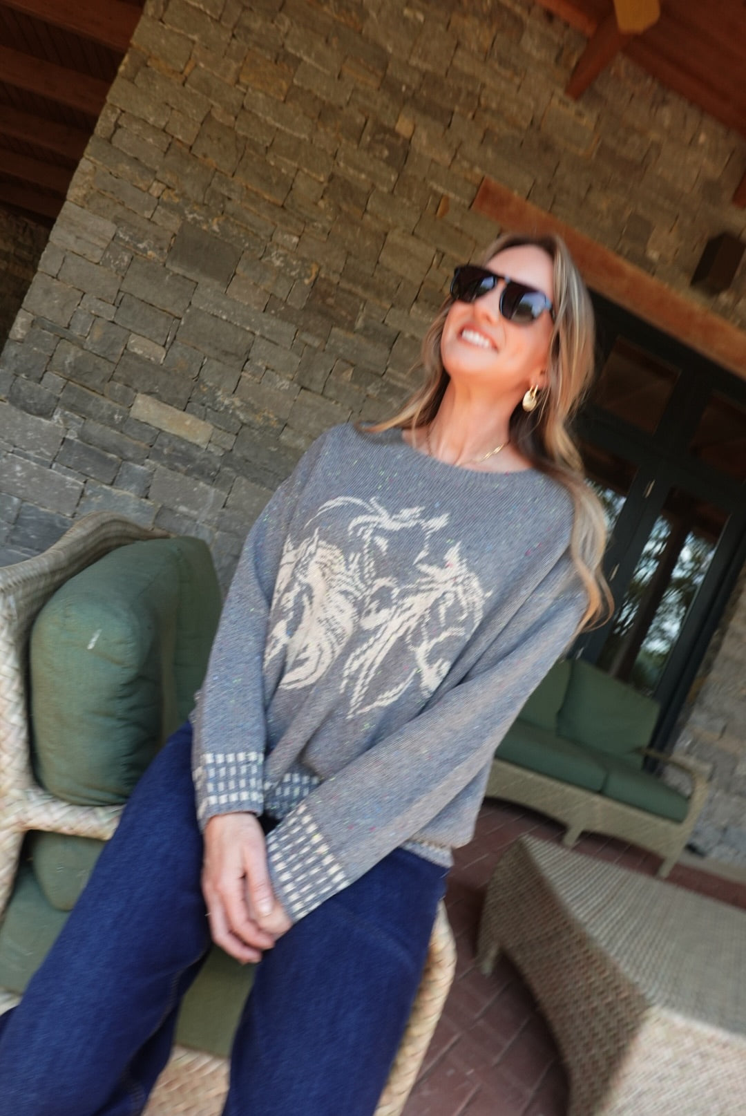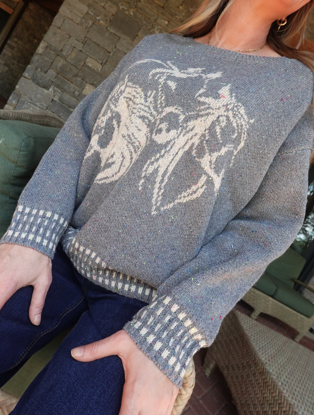 The Ranger Knit Sweater features a charming horse jacquard pattern woven throughout its long sleeves, blending classic style with cozy comfort. Crafted for warmth, this sweater offers a soft, fitted feel that supports your active lifestyle, whether you're layering for a chilly day or making a subtle statement. Durable and stylish, it's an ideal choice for those who value both practicality and refined design.