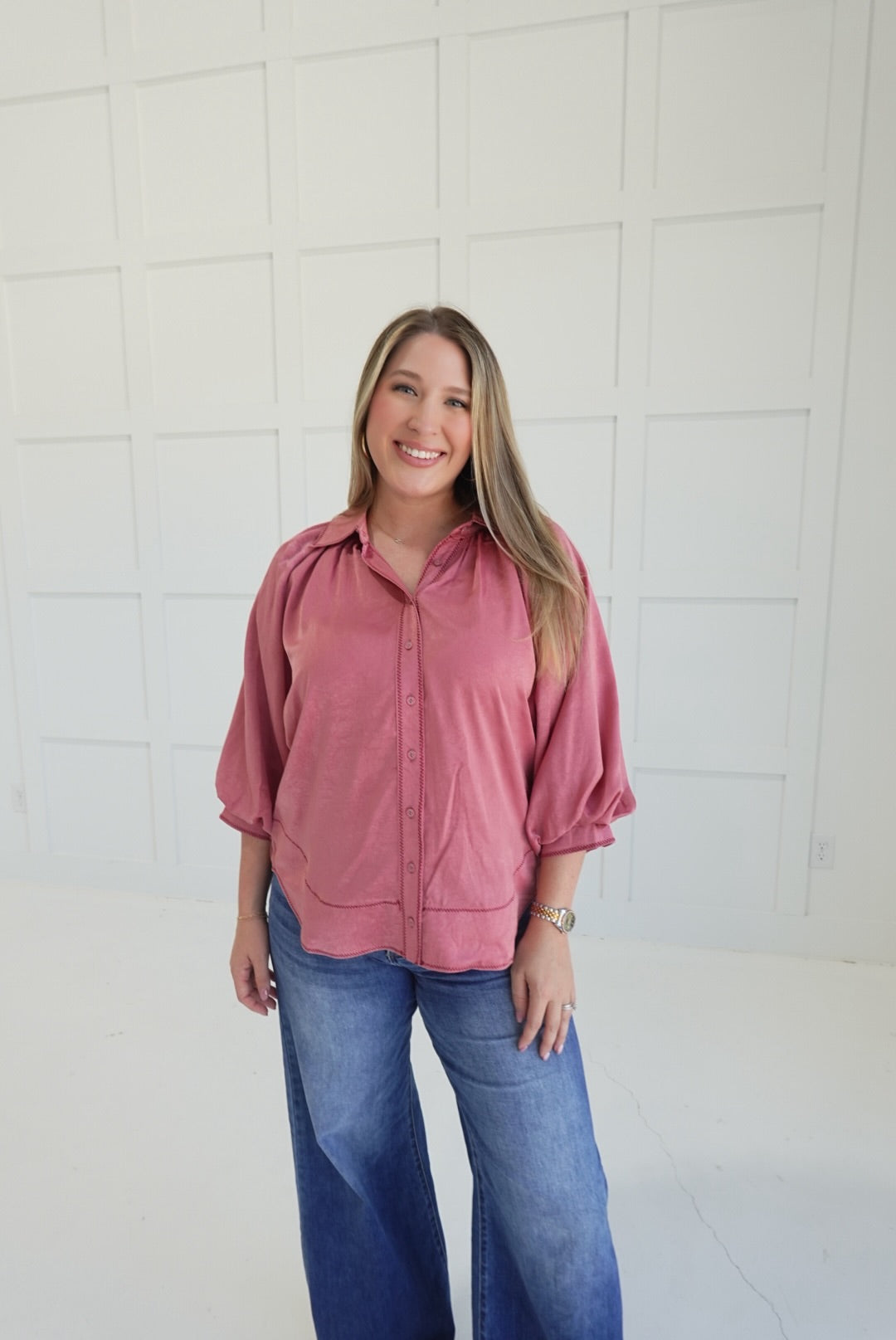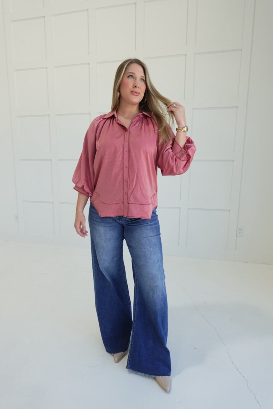 The Swoon Blouse combines elegance and comfort with its smooth satin fabric and delicate balloon sleeves. Featuring a button-down front, a wavy hem that adds subtle movement, and carefully crafted stitching details, this blouse enhances your style effortlessly. Perfect for both professional settings and casual outings, it offers a flattering fit while keeping you comfortable throughout the day.