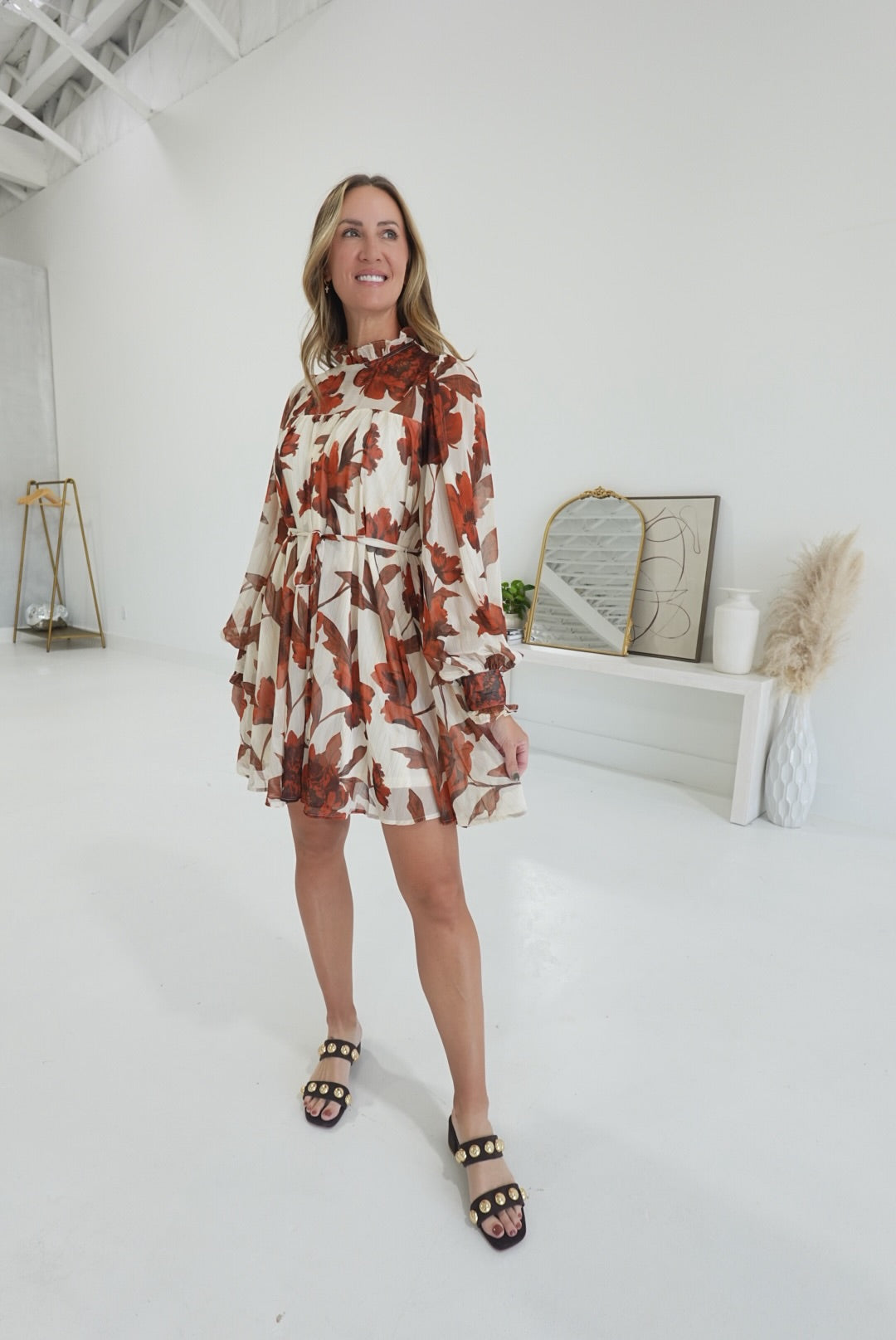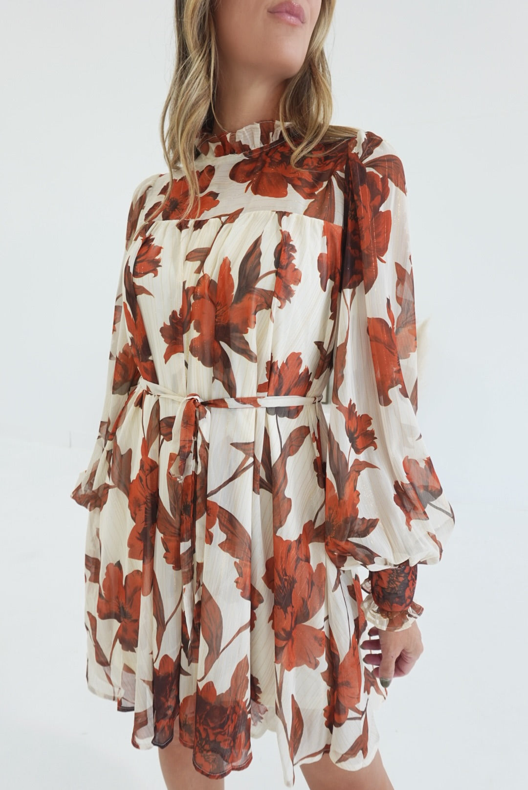 The True Autumn Mini Dress combines elegance with comfort. Its printed woven fabric drapes softly, while the high ruffled neckline and long sleeves with cuffs add a refined touch. The self sash tie enhances your silhouette, and the back neck button closure ensures an easy, secure fit. Perfect for effortless style on any occasion.
