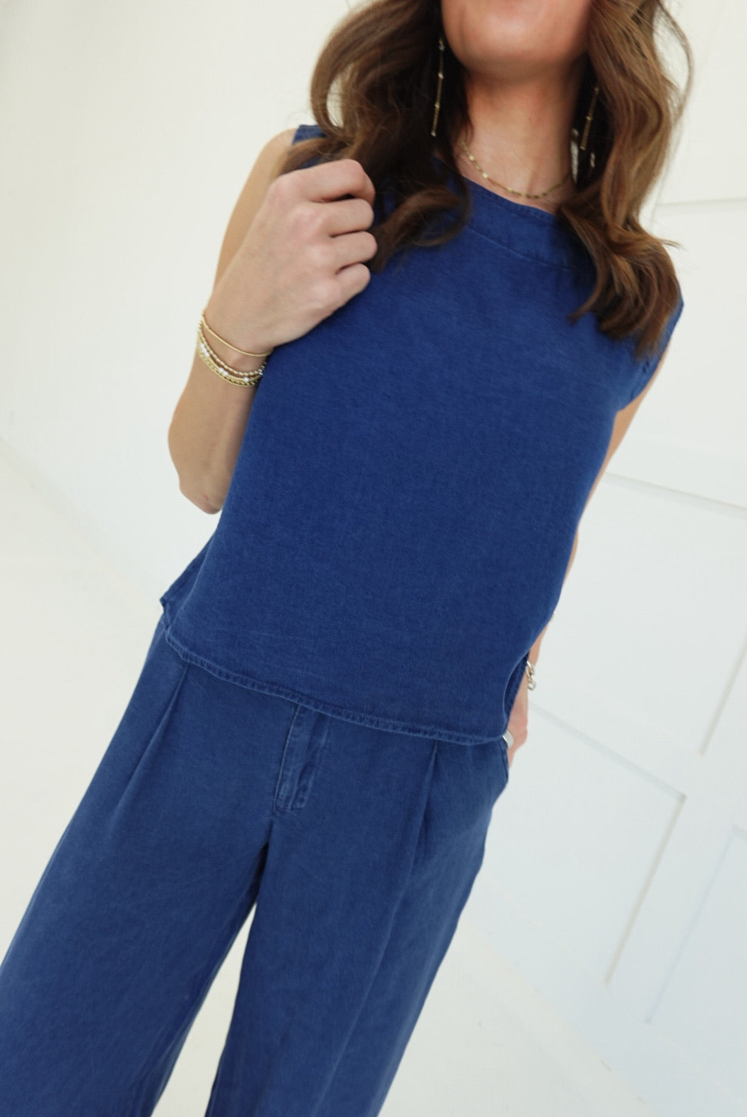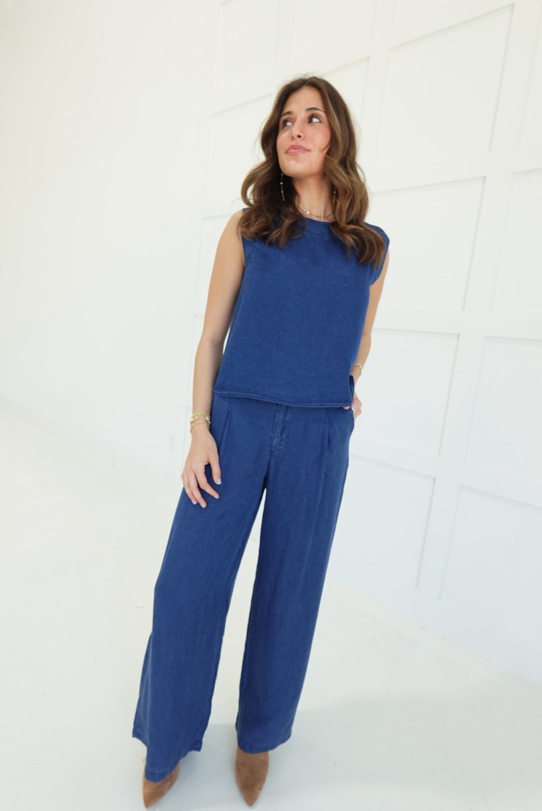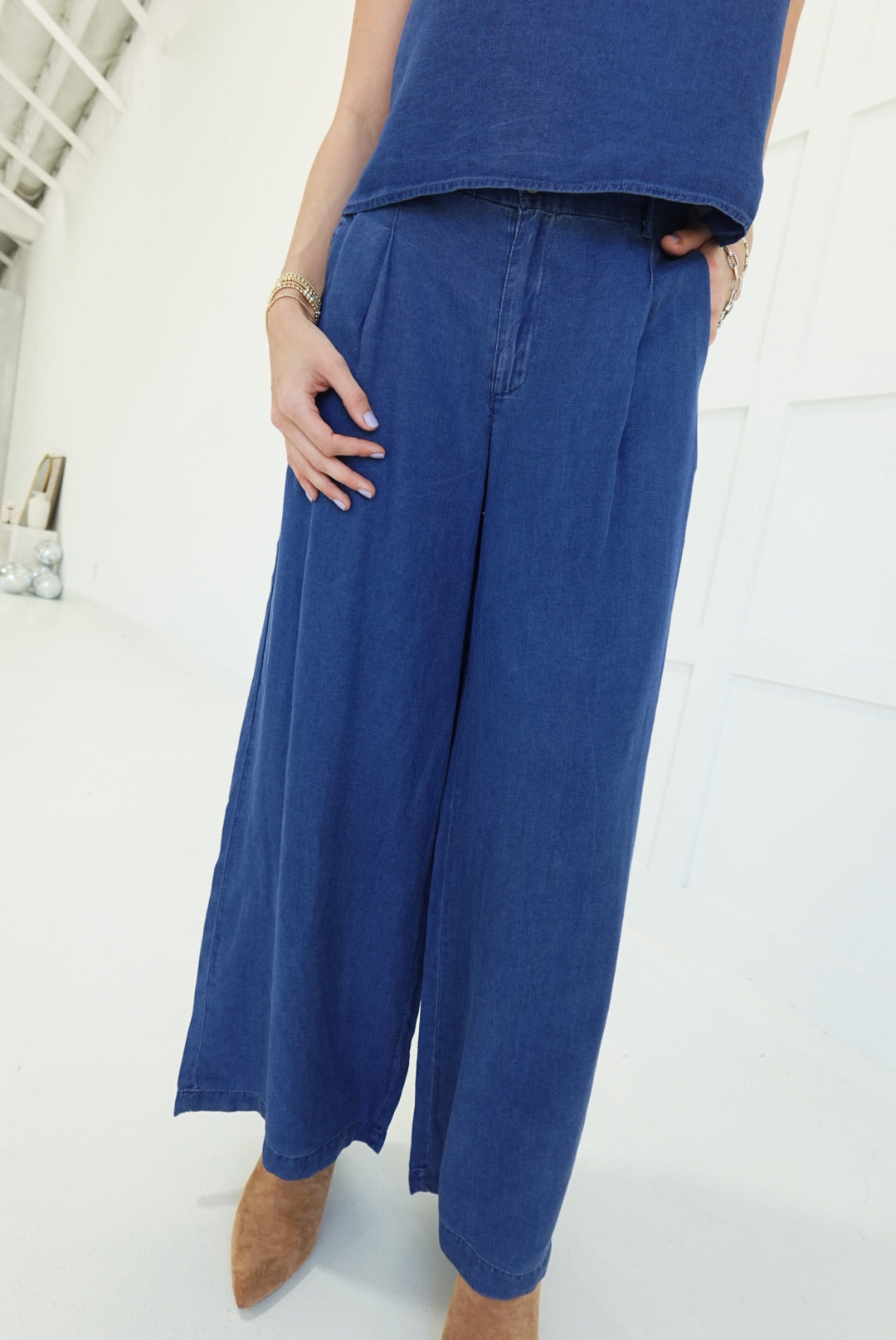 - Pintuck Detail Wide Leg Pants + Back Button Down Crop Top