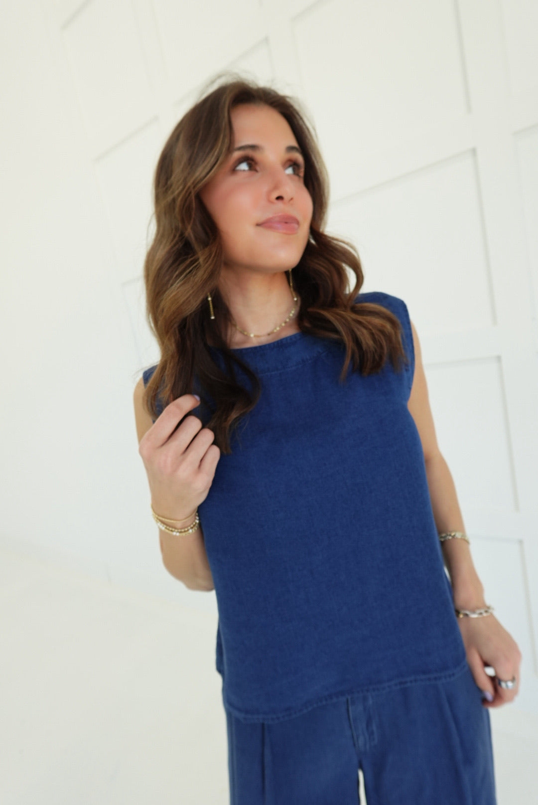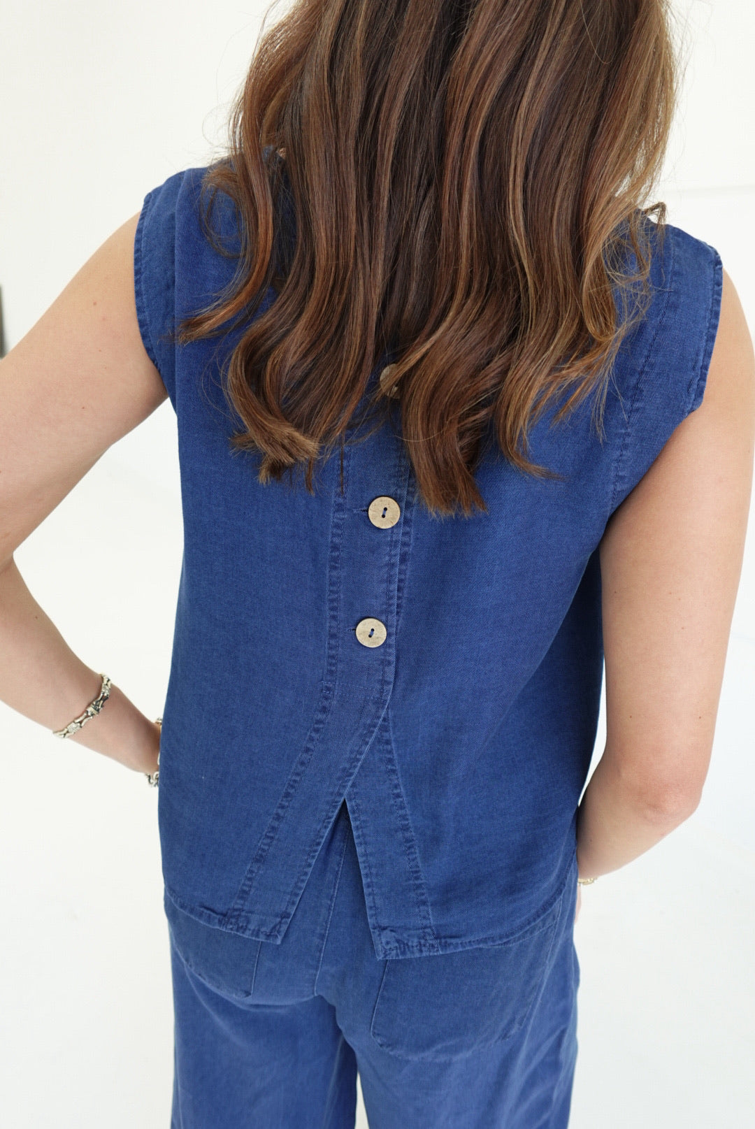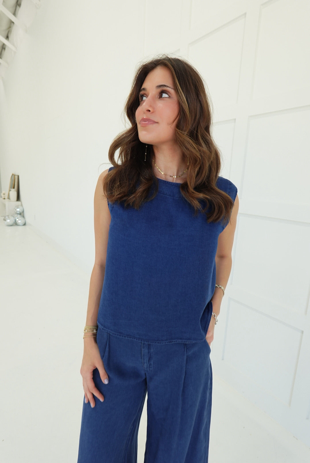 - Pintuck Detail Wide Leg Pants + Back Button Down Crop Top