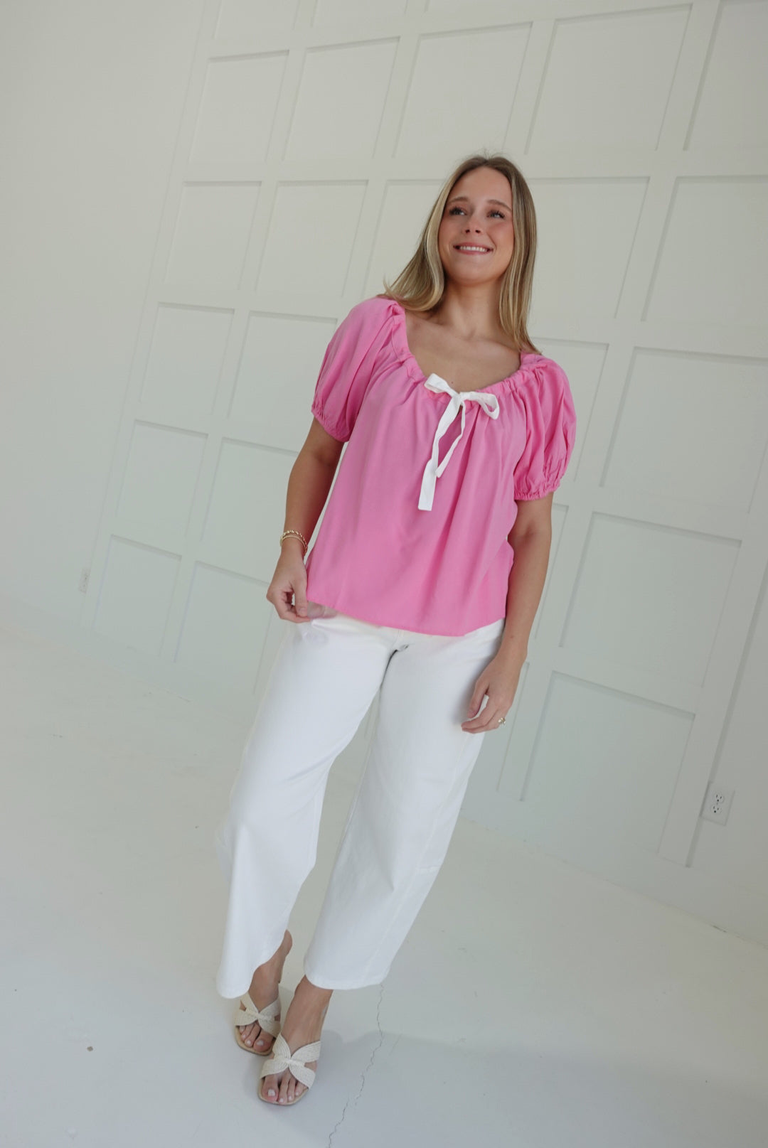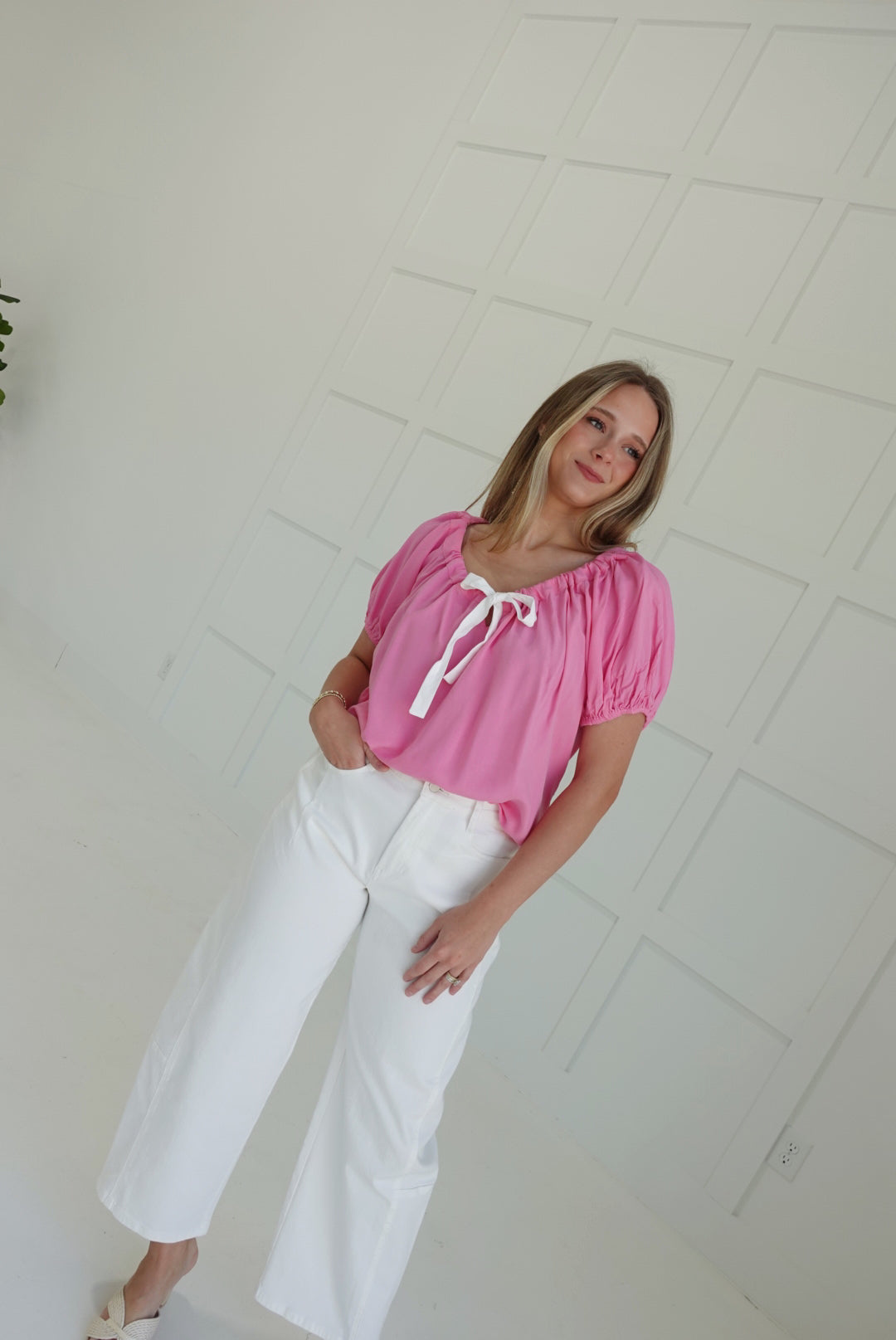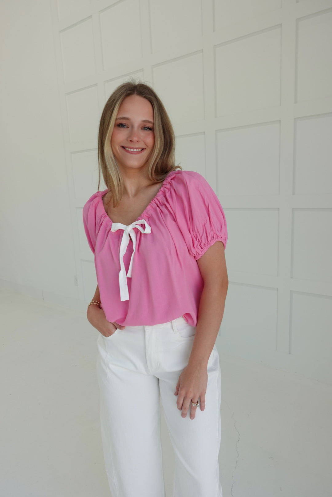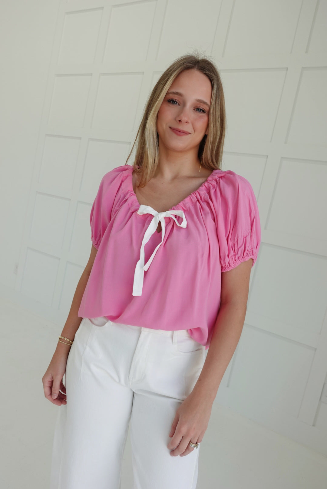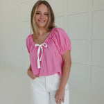 Get ready to be tickled pink this spring with our new self tie top! This top is the perfect addition to your wardrobe, with its unique front tie feature that adds a touch of fun and flair to any outfit. You'll be turning heads and feeling confident in this top all season long. Don't miss out!