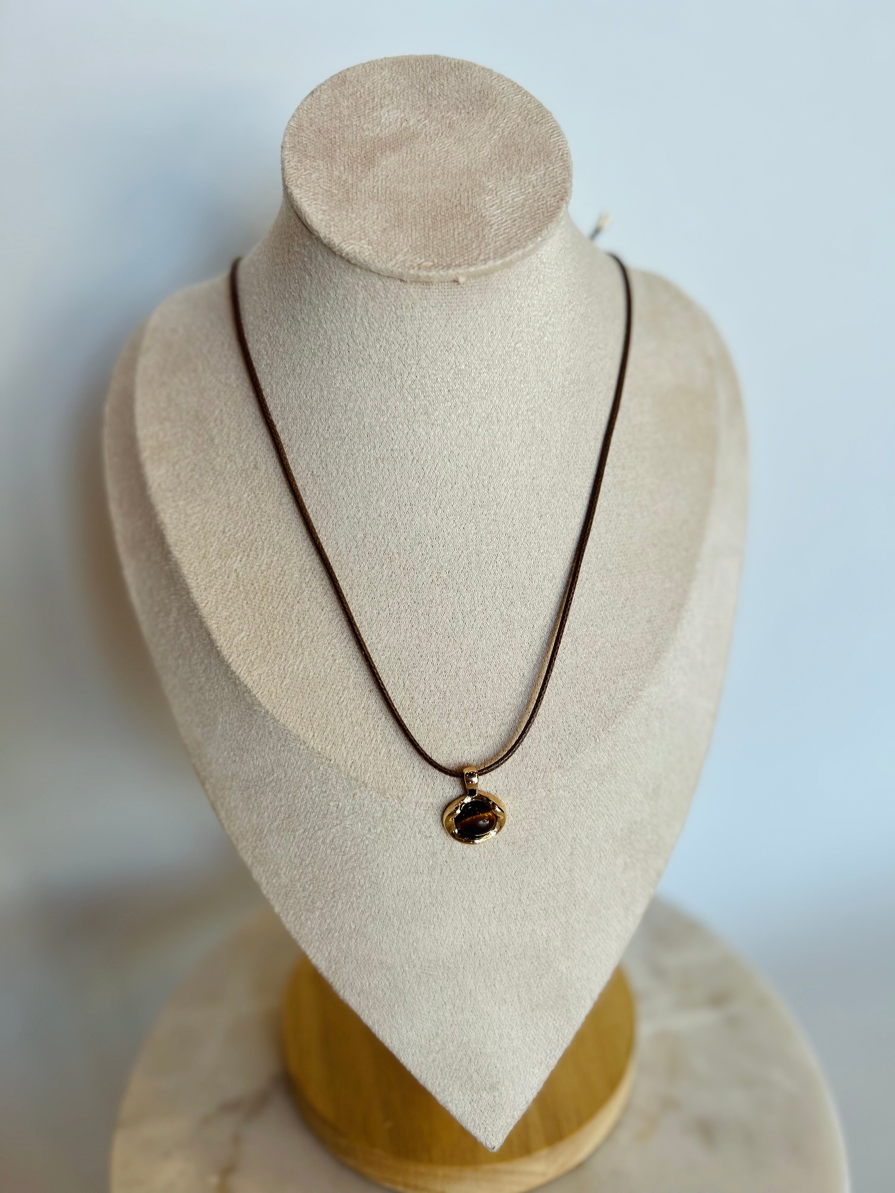 # Tiger Eye Cord Necklace Harness the bold energy of natural tiger eye stone in this striking pendant necklace. The rich golden-brown bands of this semi-precious gem catch the light with mesmerizing depth, while the adjustable cord design offers fearless versatility. Whether layered with confidence or worn as a standalone statement, this piece channels the protective power and grounded strength tiger eye is known for. Perfect for those who dare to stand out.