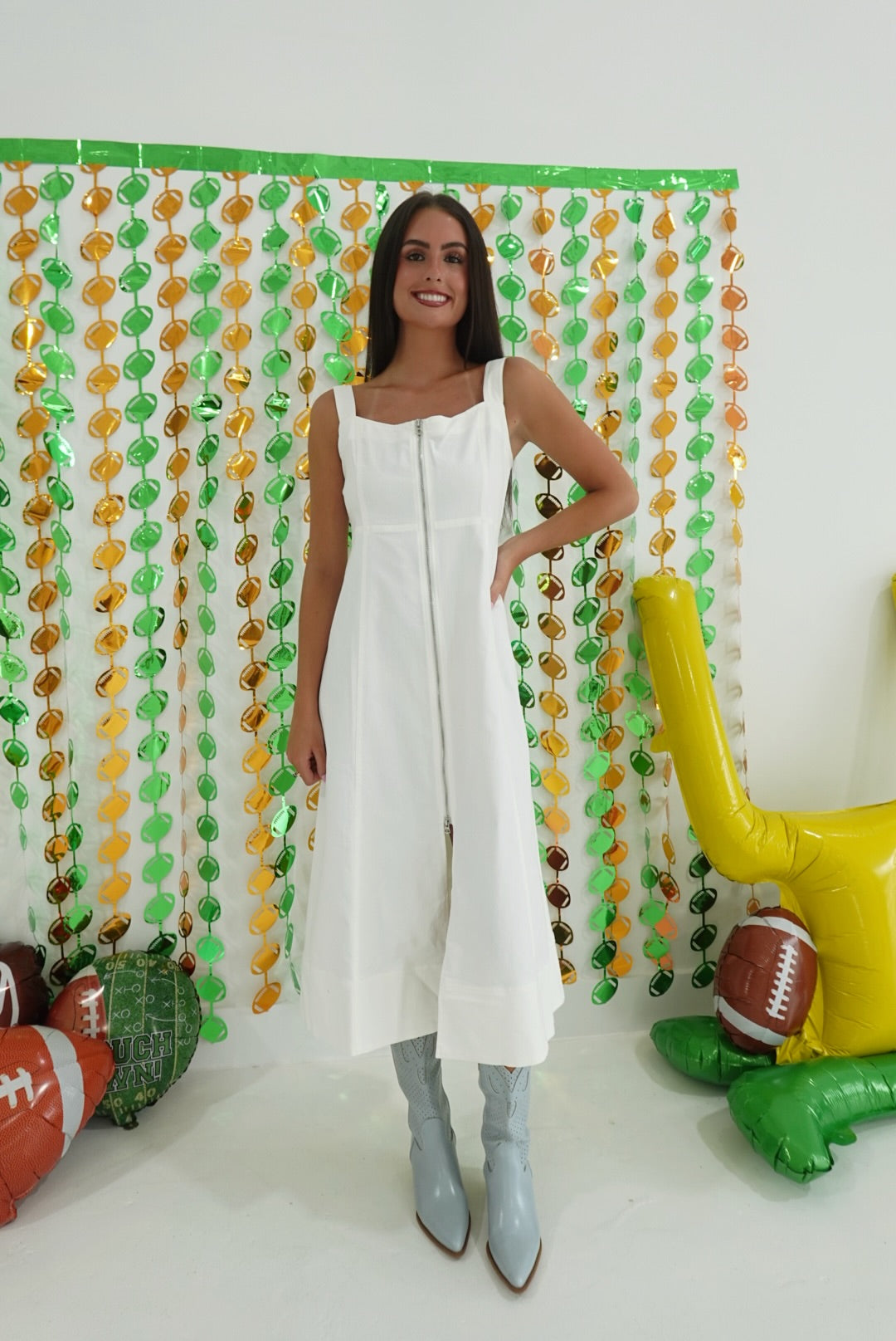 The Tish Midi Dress offers a comfortable, flattering fit with its stretchy denim-like fabric. Featuring a sleeveless design and wide straps, it provides ease of movement and support throughout the day. The front zipper adds a stylish touch while allowing for easy wear. Perfect for casual outings or dressing up, this midi dress combines practicality with a modern look you'll feel confident in.