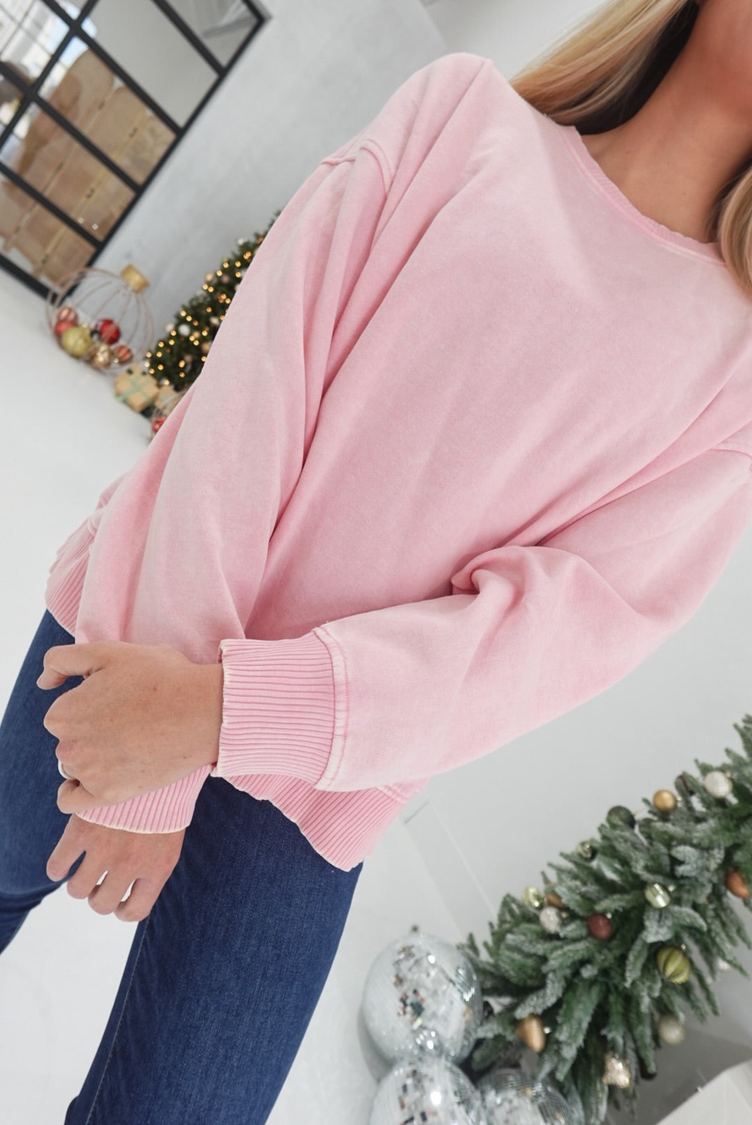 An acid wash fleece fabric that feels soft against your skin. Its oversized fit and balloon sleeves offer relaxed ease and stylish volume, while the overlap neckband adds a unique touch for extra warmth. Perfect for layering or lounging, this pullover supports your need for both comfort and casual style.