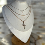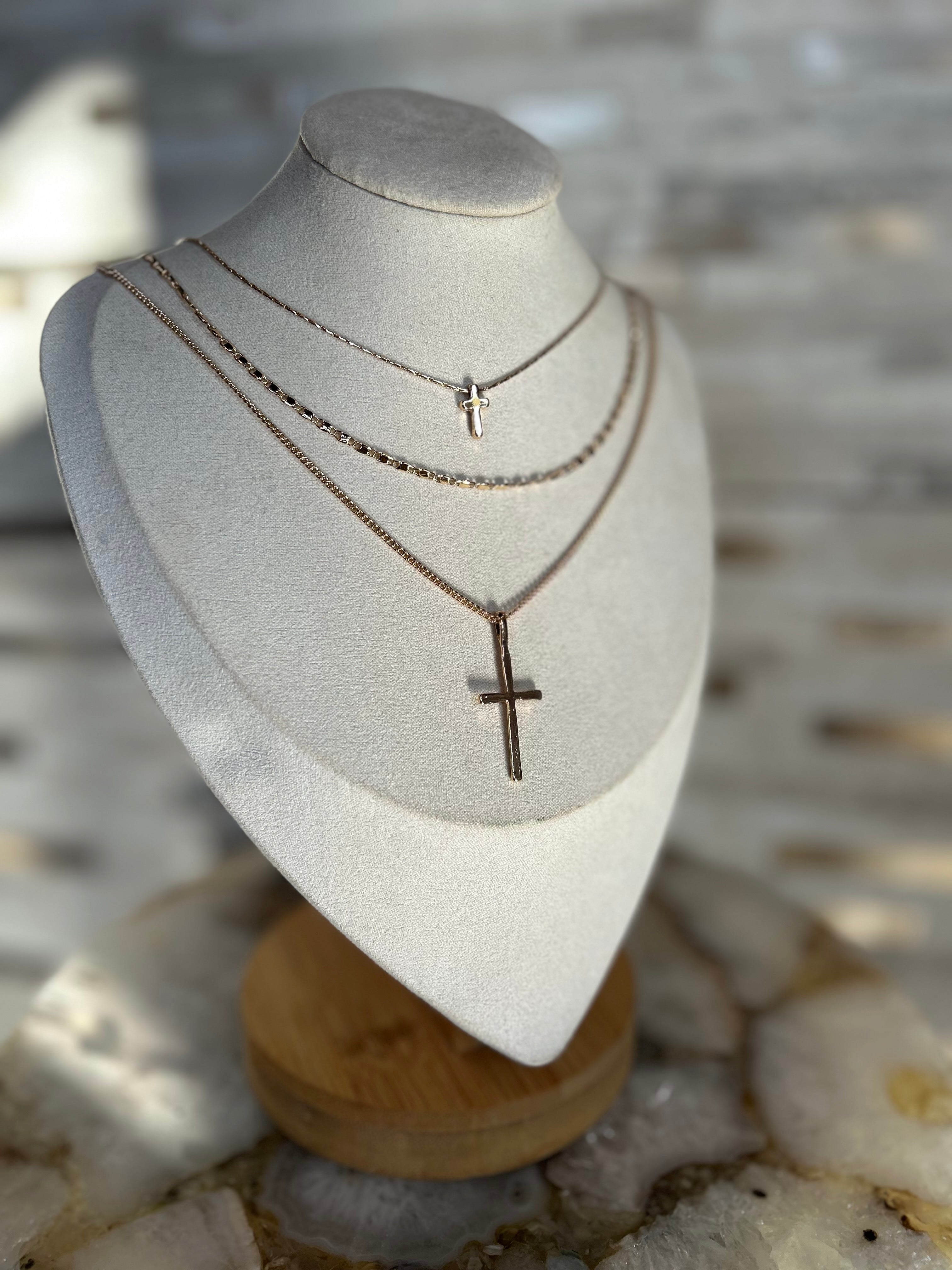 Elevate your everyday style with this striking tri-layer cross pendant necklace. Featuring three delicate chains working together in perfect harmony, this piece combines spiritual symbolism with modern sophistication. The layered design creates beautiful dimension and movement, making it versatile enough for casual wear or special occasions. Whether you're drawn to its meaningful design or simply love the elegant aesthetic, this necklace is a thoughtful addition to any jewelry collection that celebrates both faith and fashion.