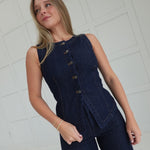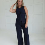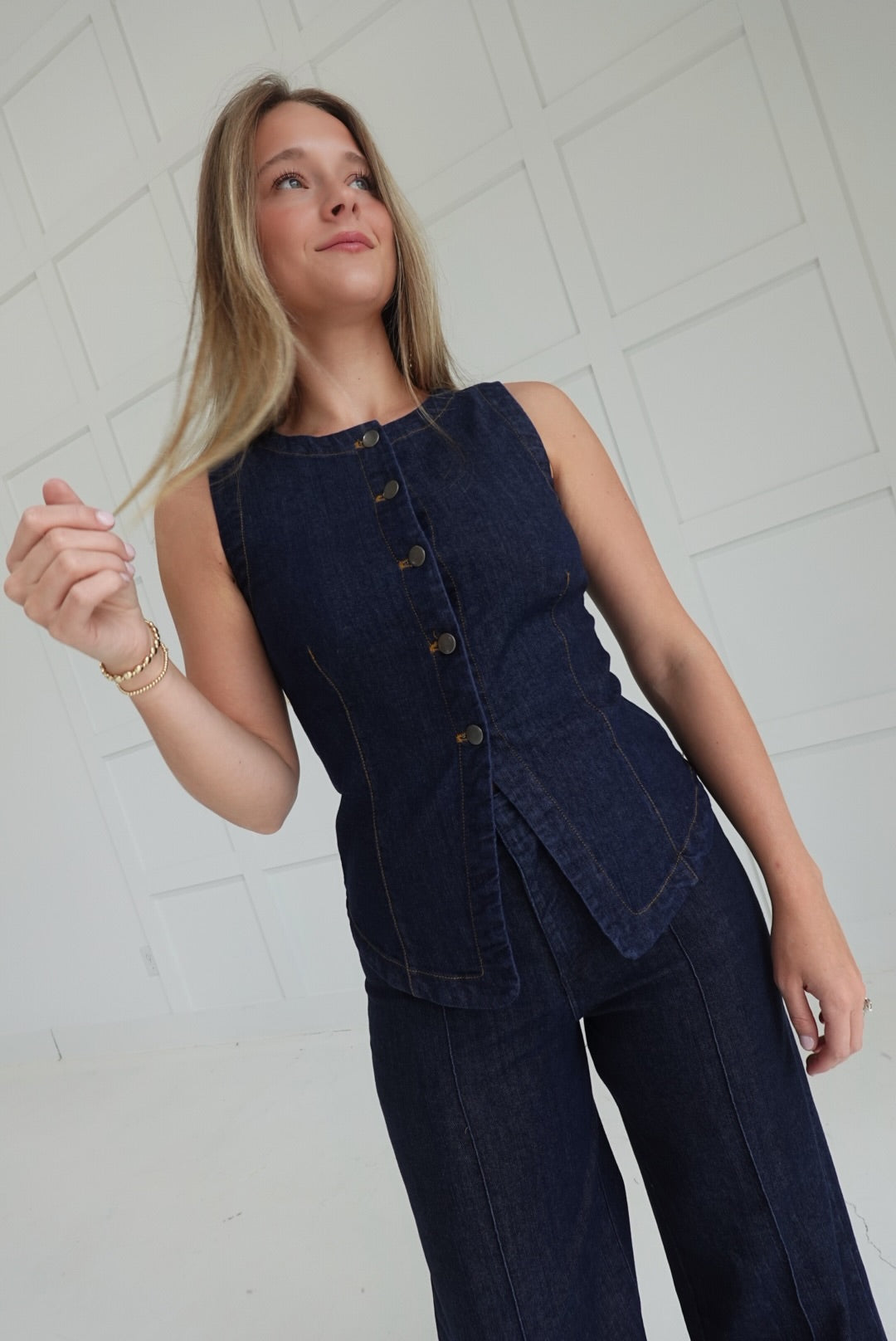 - Denim Set - Sleeveless Denim Vest + Front Seam Wide Leg Trousers