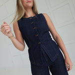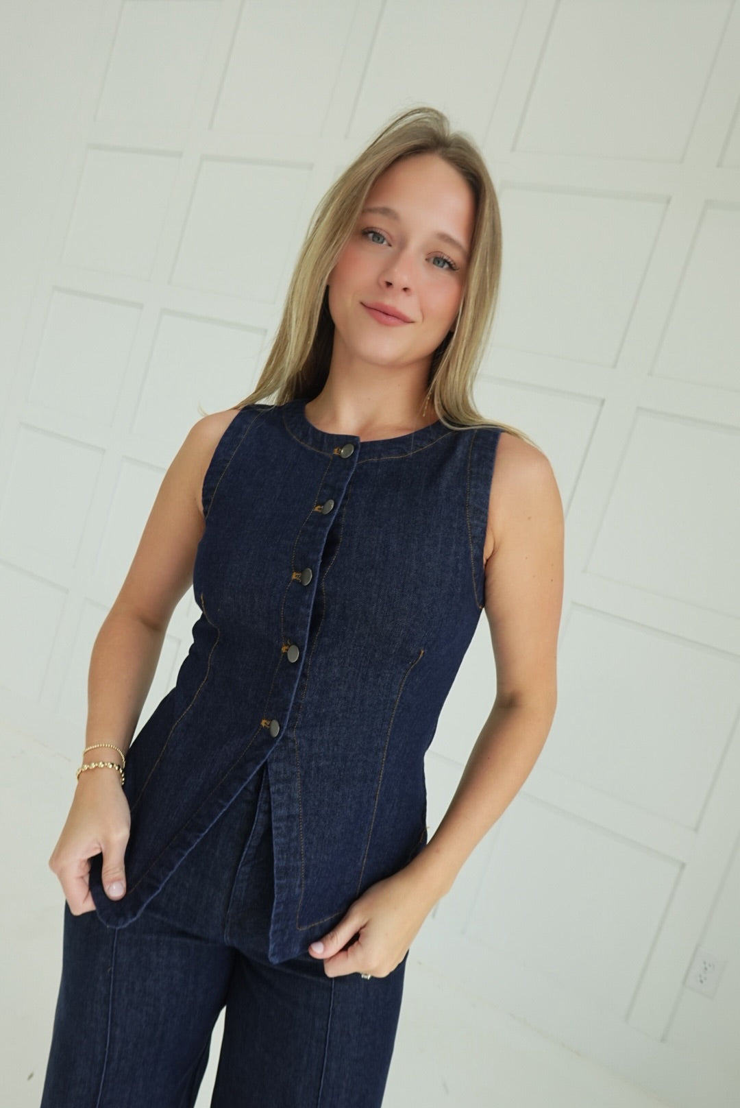 Elevate your casual style with the Turning Heads Denim Set, featuring a sleeveless denim vest paired with wide-leg jeans. The vest’s clean front seams add a tailored touch, while the wide-leg jeans offer a comfortable, flattering fit that moves with you. Together, this set creates a versatile, confident look perfect for day-to-night wear.