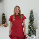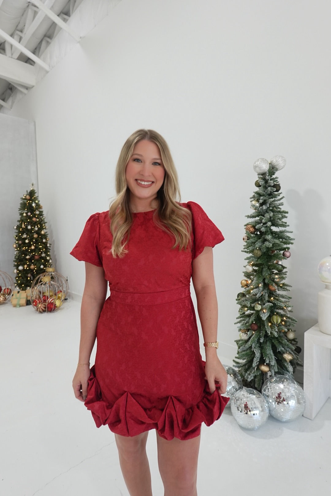 Celebrate the season in this charming mini dress featuring an elegant floral pattern jacquard fabric that catches the light beautifully. The short puff sleeves add a playful, feminine touch, while the delicate ruffle hem creates movement and dimension. Perfect for holiday gatherings, festive occasions, or whenever you want to feel special and put-together. This dress combines classic elegance with modern style, making it a versatile piece you'll reach for again and again.