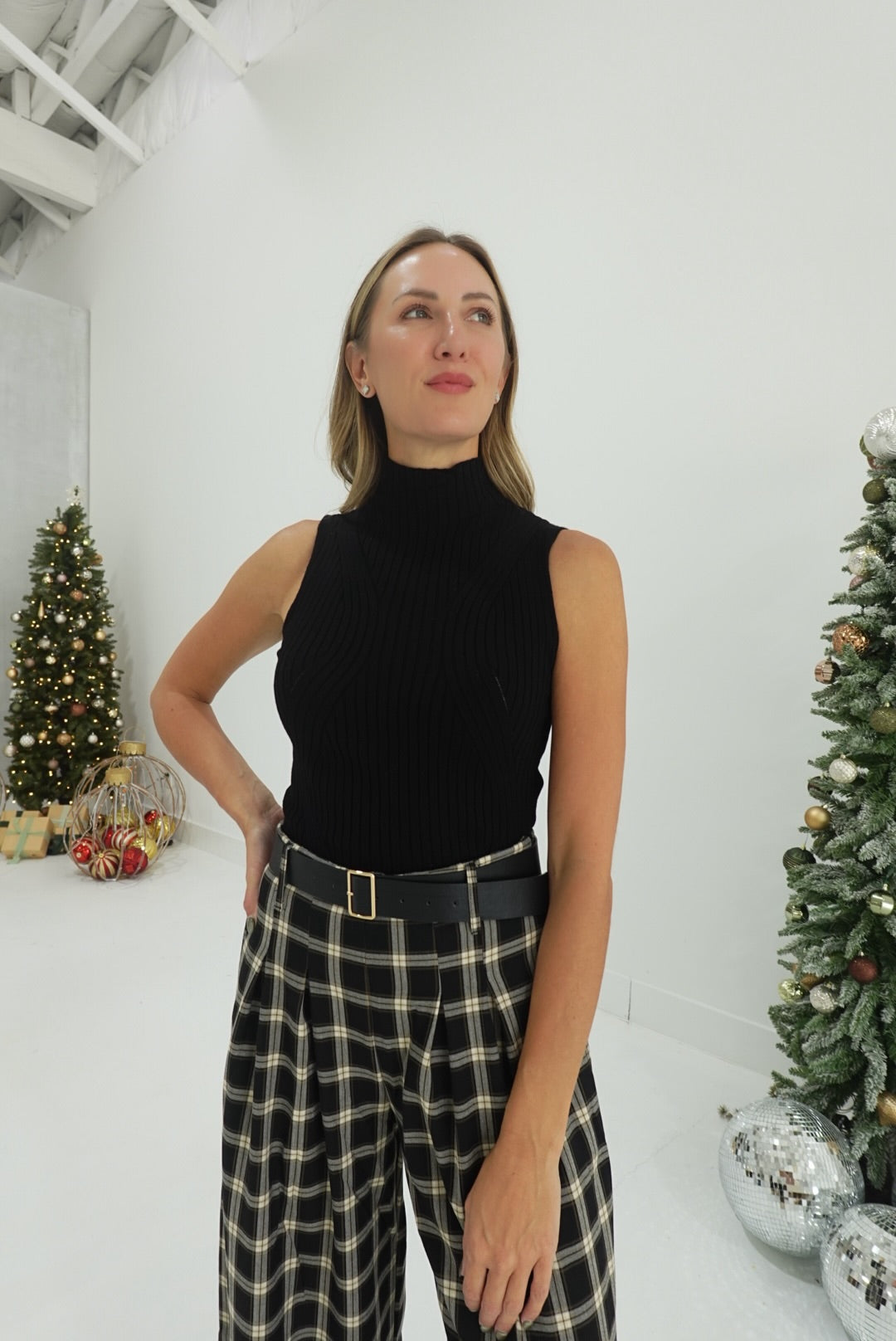 This sleeveless high neck ribbed sweater top offers a perfect blend of comfort and style. Its soft, stretchy fabric gently hugs the body, providing a flattering fit without sacrificing ease of movement. The high neck adds a touch of sophistication, making it an ideal choice for layering or wearing on its own. Whether dressing up or down, this top supports your look with timeless elegance and versatility.