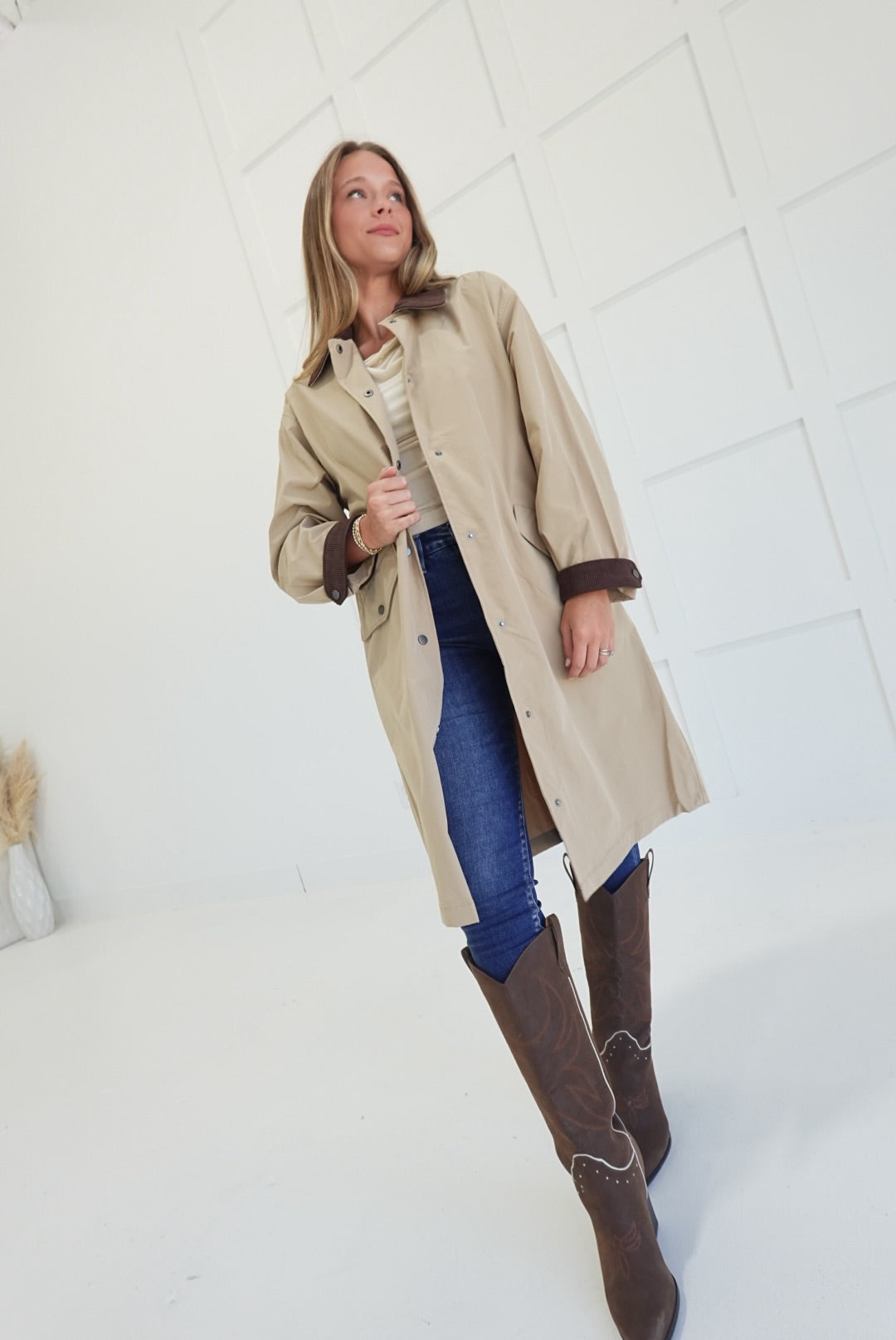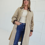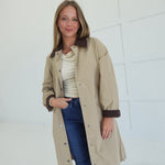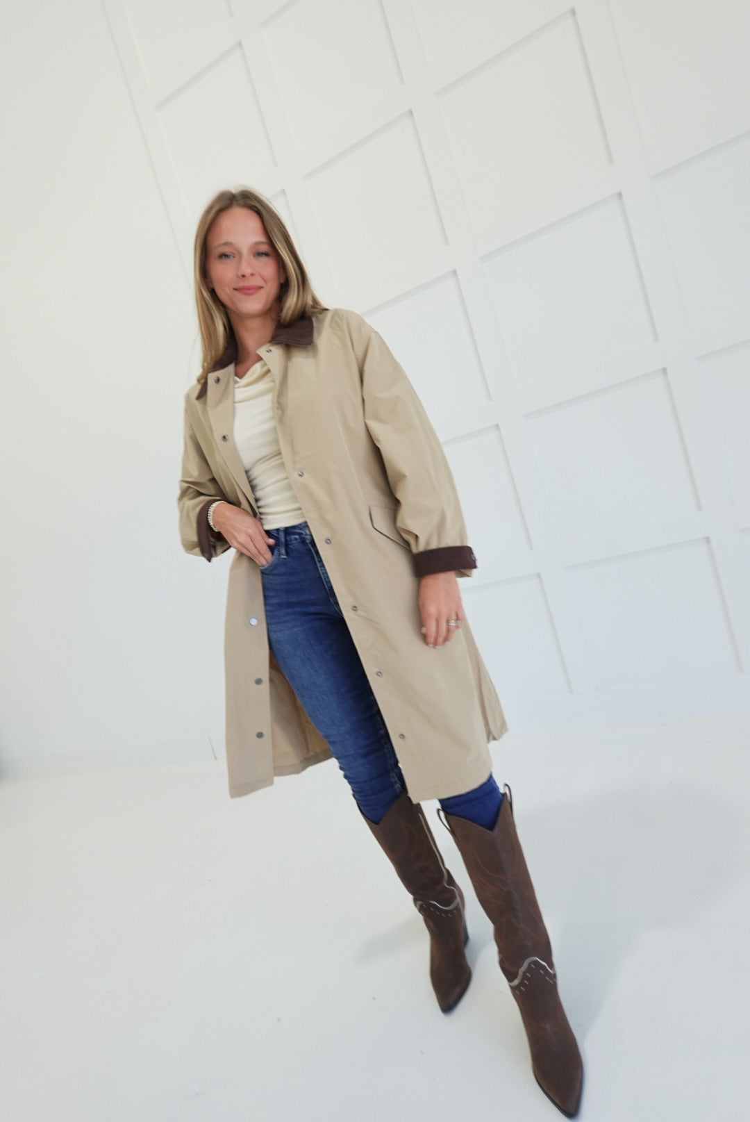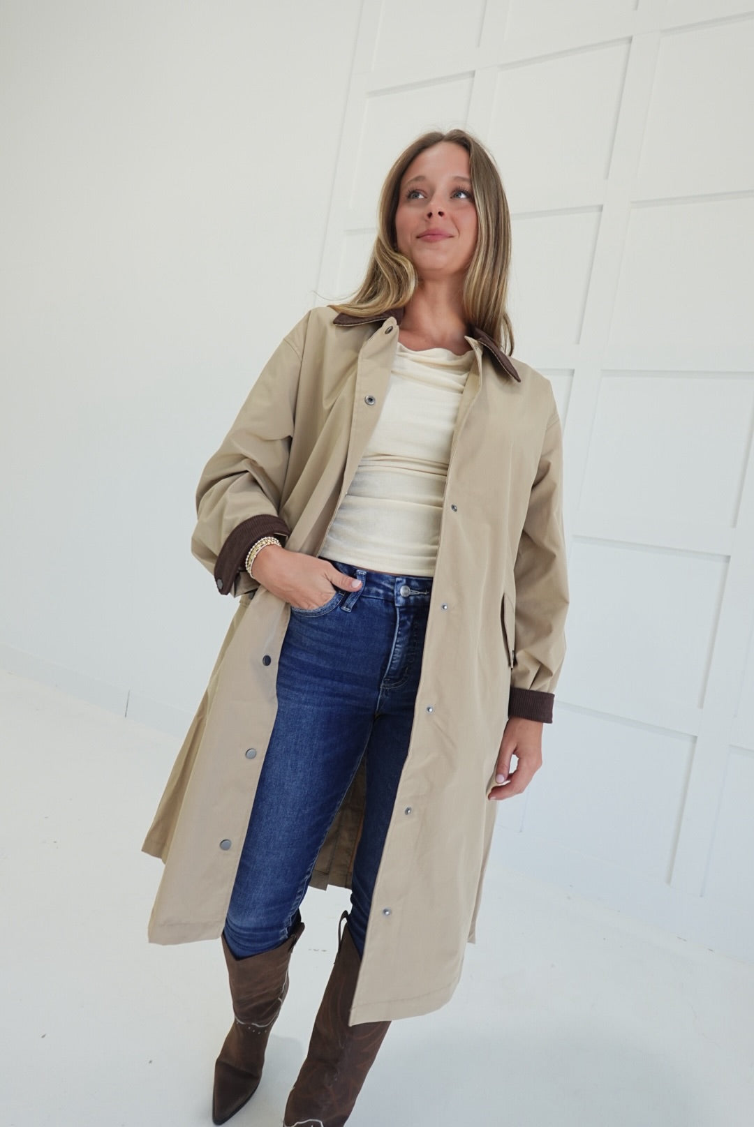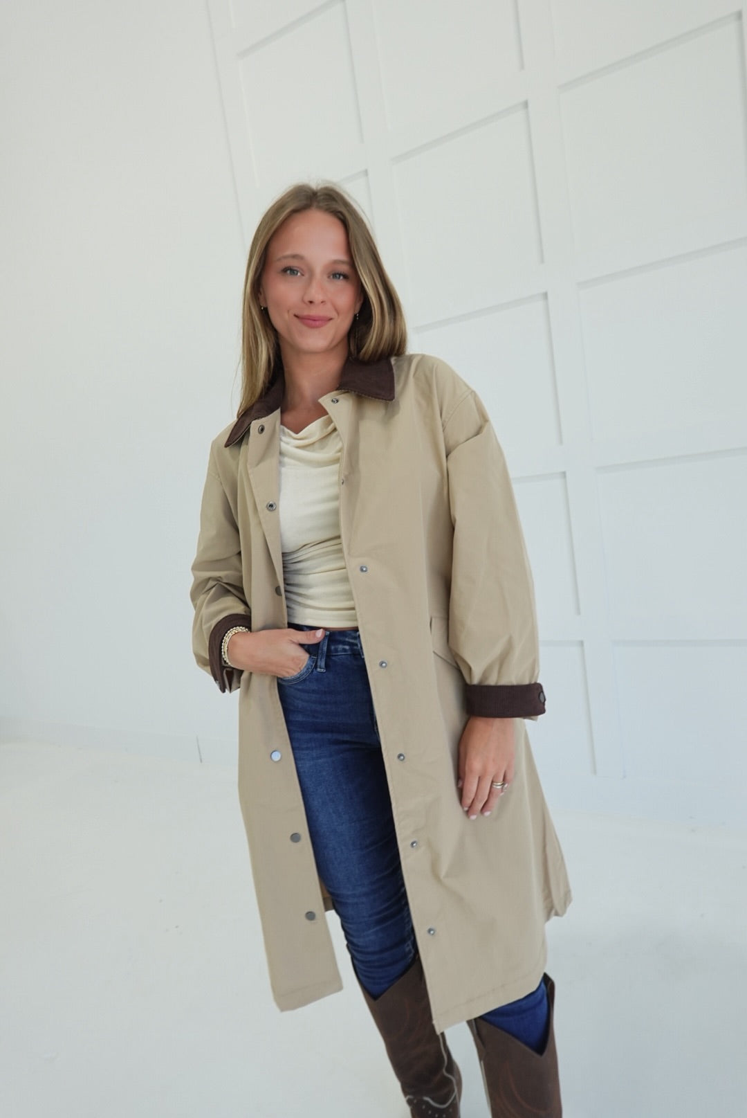 The Up-State Trench Coat in Khaki offers a stylish blend of classic and modern design with its contrast collar and snap button detailing. Its long sleeves provide versatile coverage, making it perfect for layering during cooler days. Crafted to combine practicality with a polished look, this trench coat is an excellent choice to elevate your wardrobe while keeping you comfortably protected from the elements.