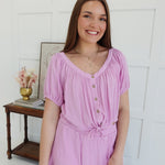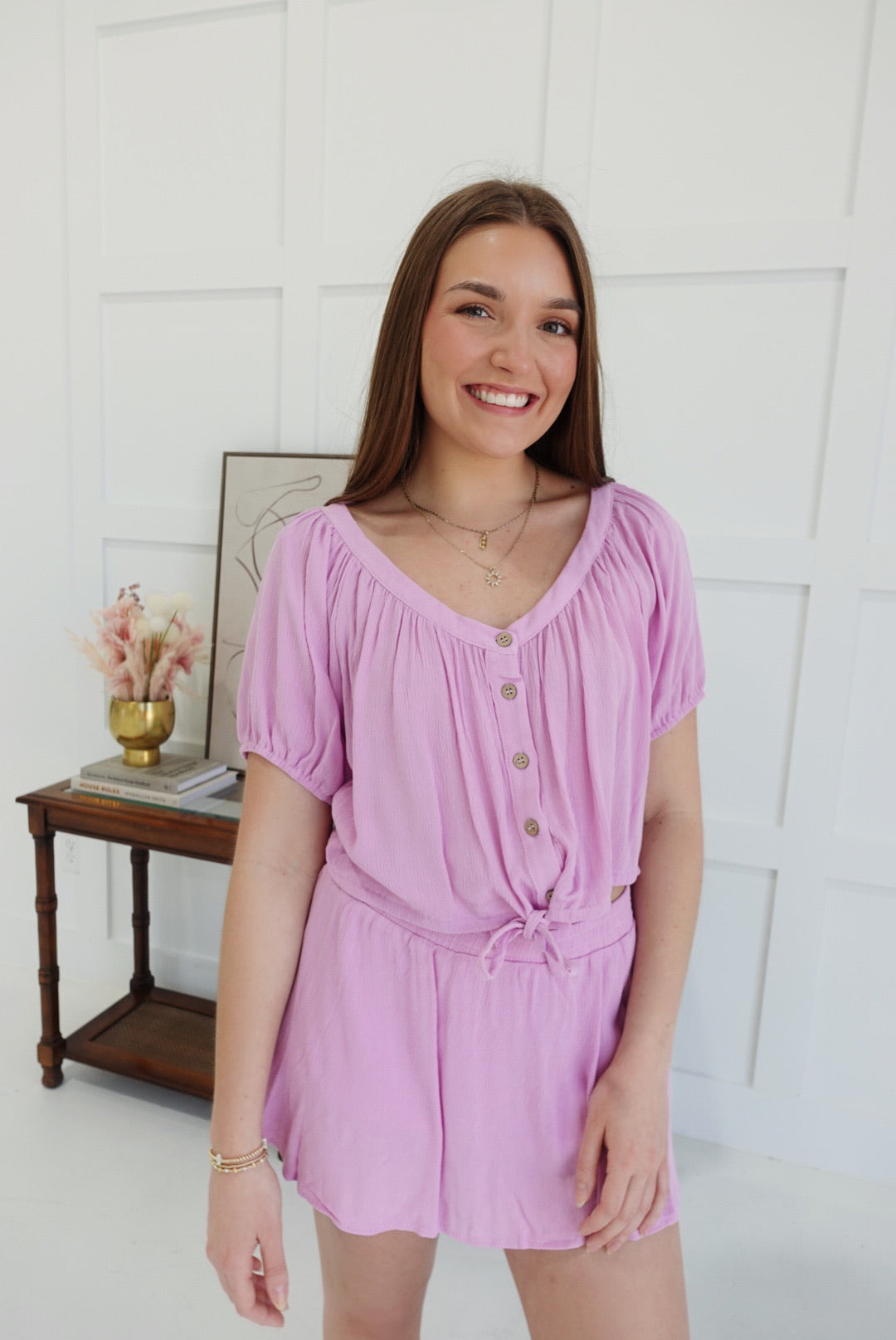 The Up The Coast Set features a unique U-neckline with gathered detailing for a flattering fit. Short sleeves lead to a button-front placket and an elasticized hem for added comfort. The matching skort has an elasticized waist and a flowy silhouette, making it perfect for all your summer adventures.