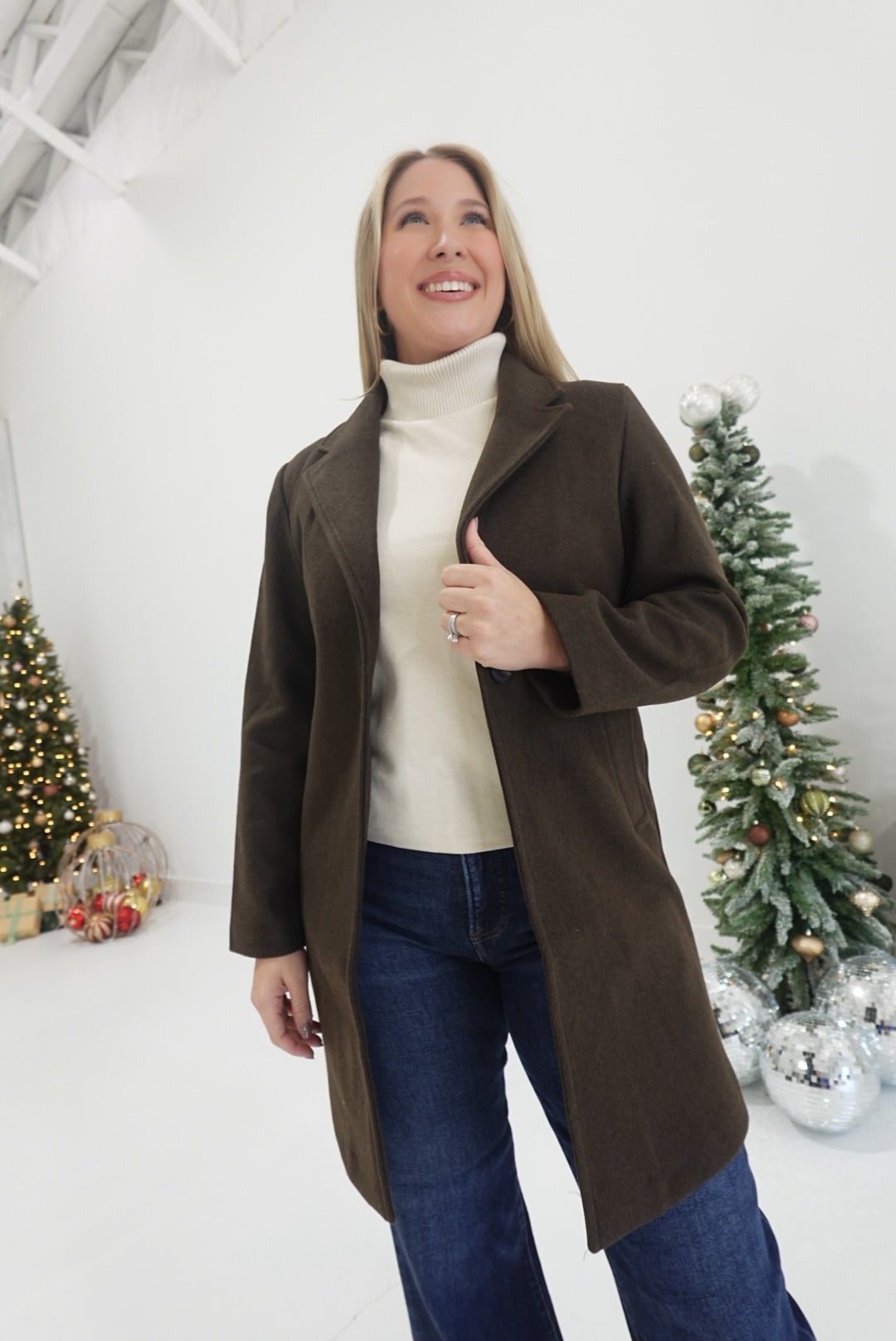 The Up-Town Coat features a classic notched lapel and long sleeves, offering timeless style with versatile comfort. Its neutral tone pairs effortlessly with any outfit, making it a reliable choice for layering through cooler days. Designed to keep you warm without sacrificing sophistication, this coat adds a polished finish to your wardrobe essentials.