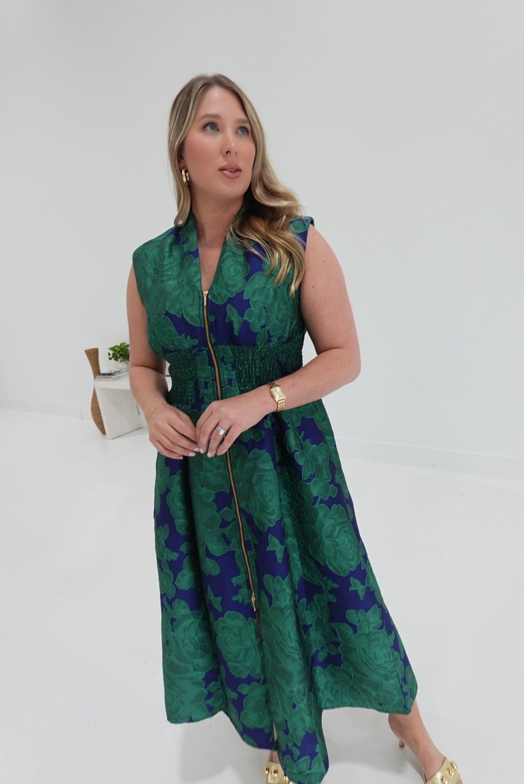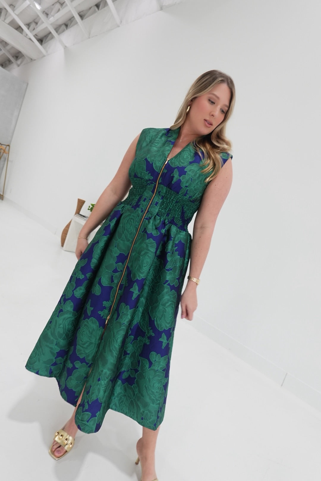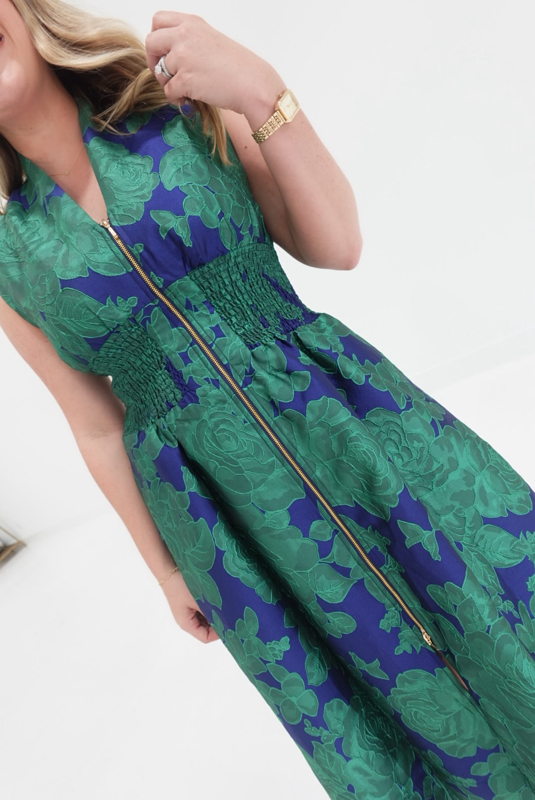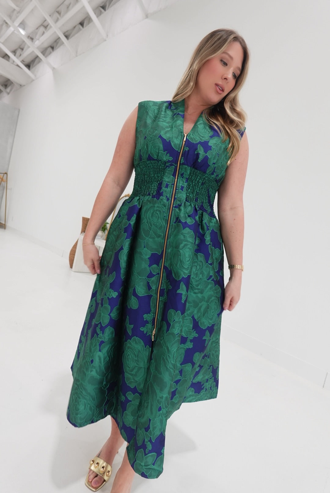 Embrace elegance and comfort with the Vera Midi Dress, featuring a bold floral jacquard fabric that adds vibrant texture and style. Its front zip closure ensures easy wear, while the flattering V-neckline highlights your silhouette gracefully. Perfect for any occasion, this midi-length dress combines confident design with effortless charm to support your standout look.