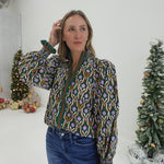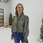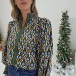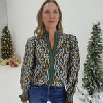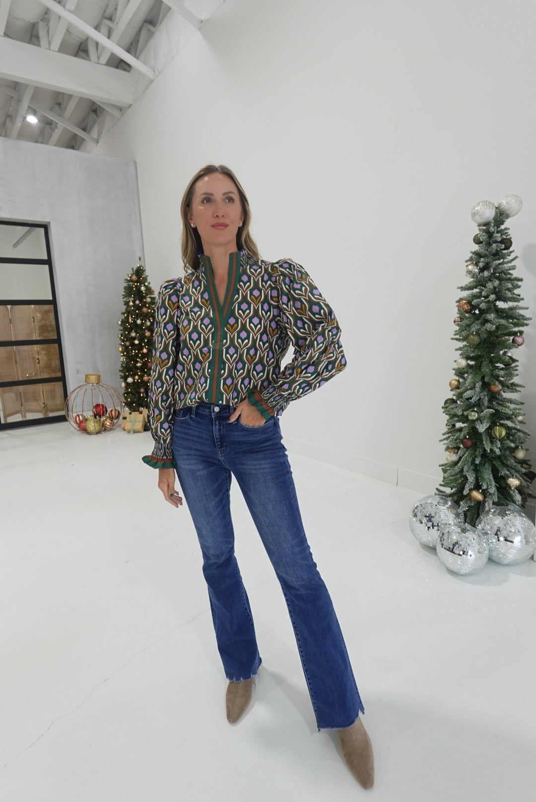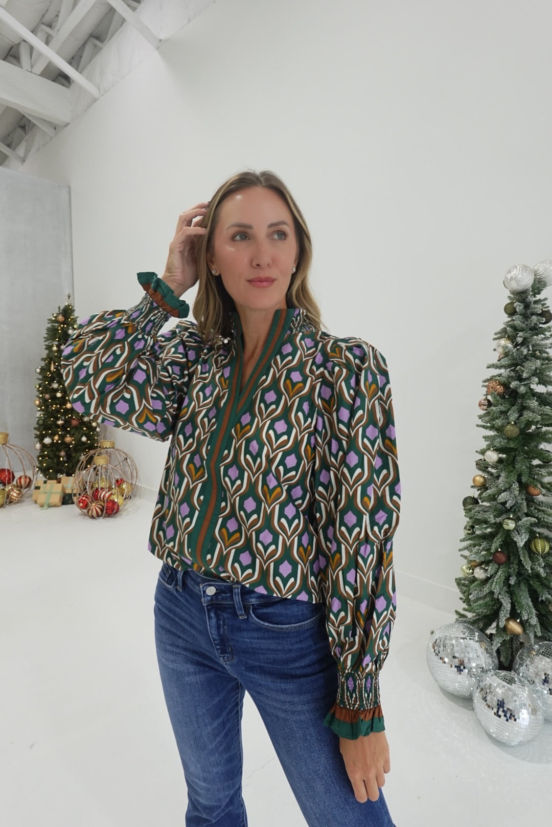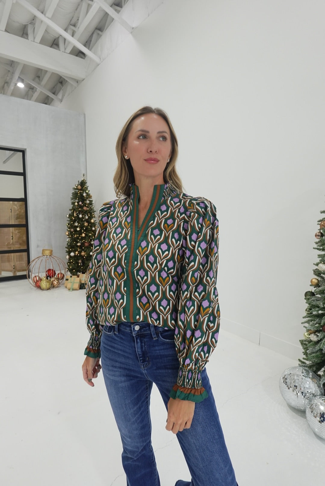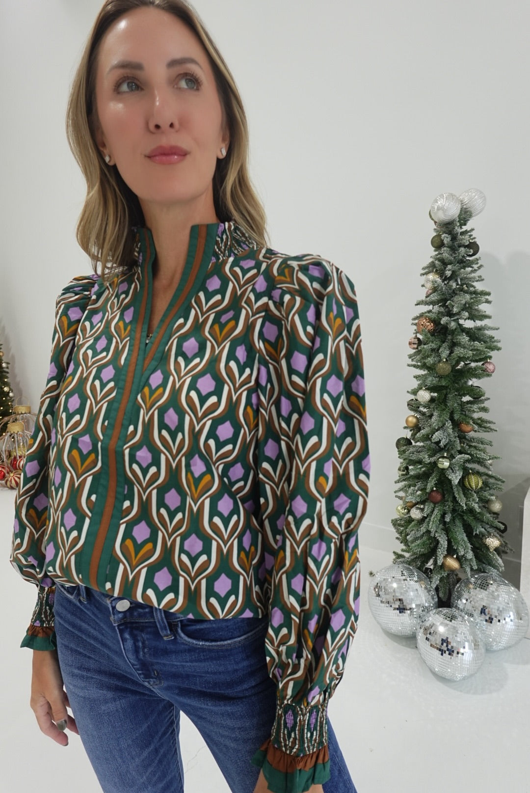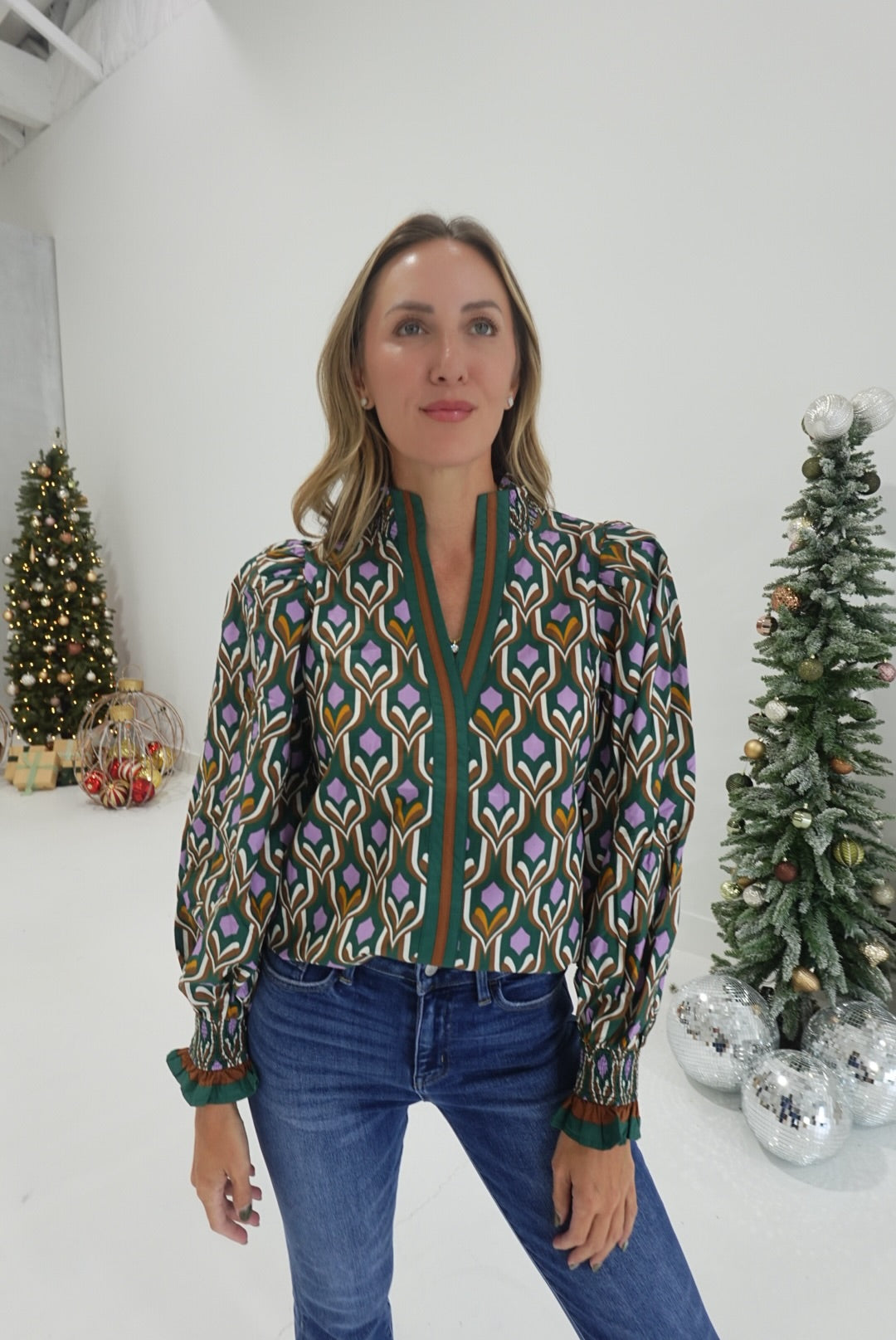 The Vina Geo Top brings effortless style to your everyday wardrobe. This lightweight woven piece features an eye-catching geometric print paired with refined contrast trim detailing. The split mock neck and smocked cuffs add dimension and visual interest, while the smocked design at the neckline creates a flattering, textured look. Unlined and non-sheer, it's designed for comfortable all-day wear. Perfect for layering or wearing solo, this versatile top transitions seamlessly from season to season.