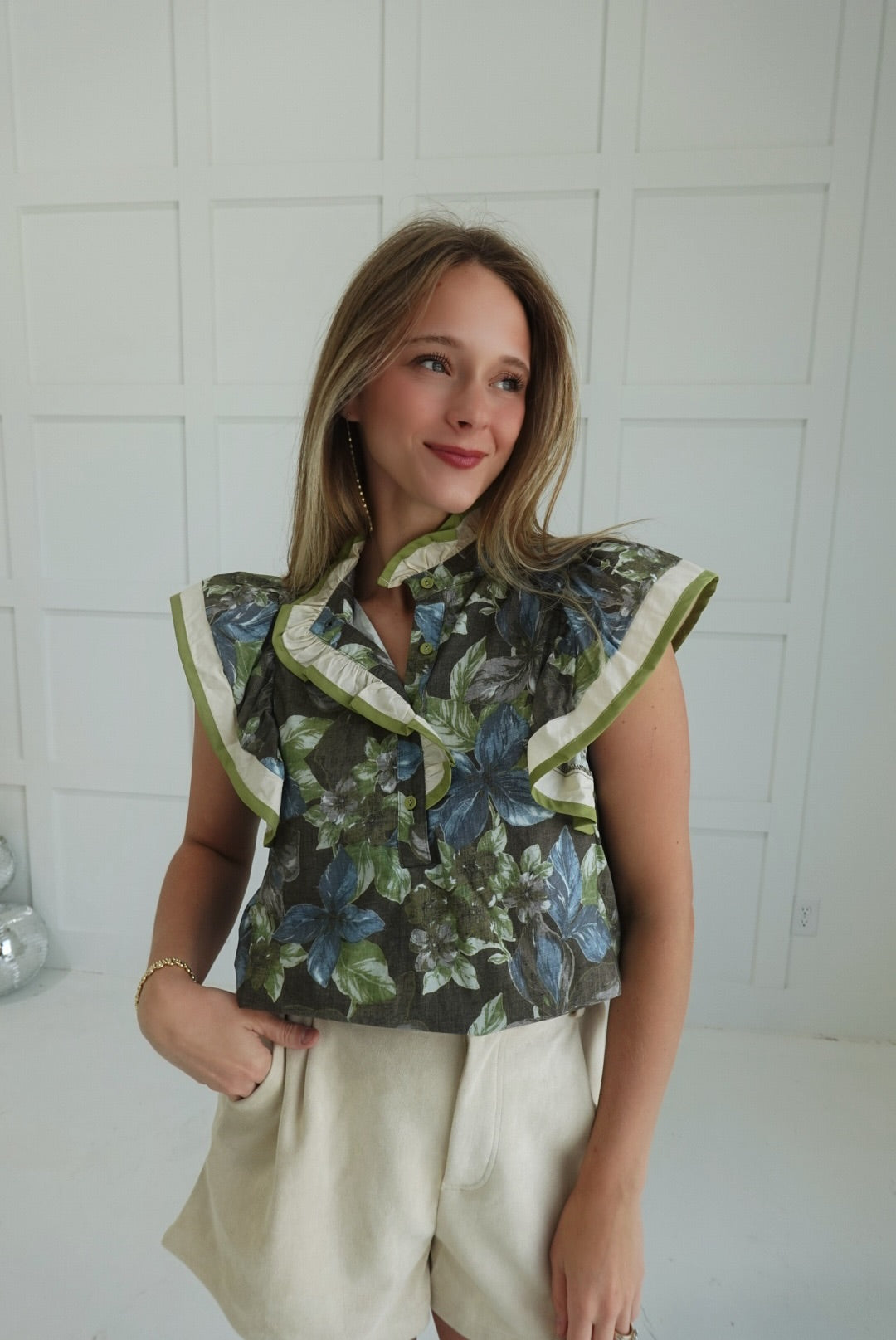 Embrace effortless style with the Vintage Lease Top in Ash Brown. This lightweight woven blouse features a vibrant floral print with multicolor contrast accents and delicate ruffle details along the flutter sleeves and band collar. The button-front closure adds a classic touch, while the unlined, non-sheer fabric ensures comfortable wear all day. Perfect for adding a feminine, vintage-inspired flair to your wardrobe.