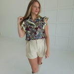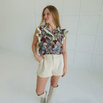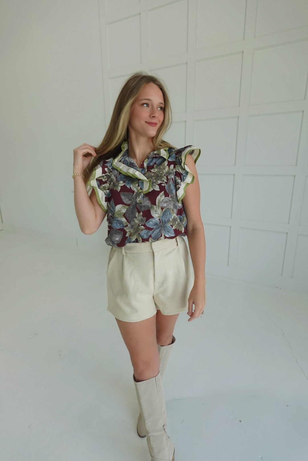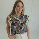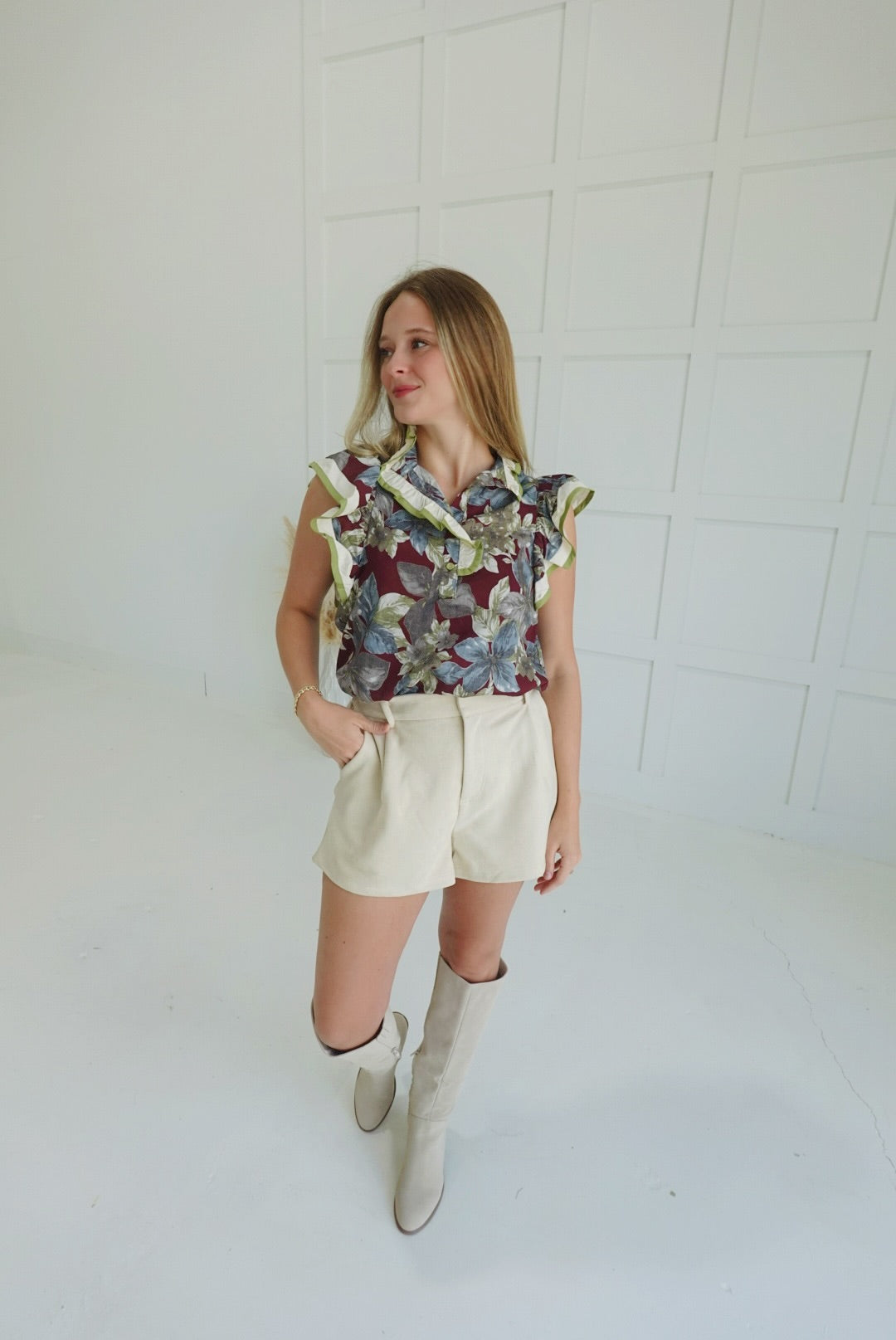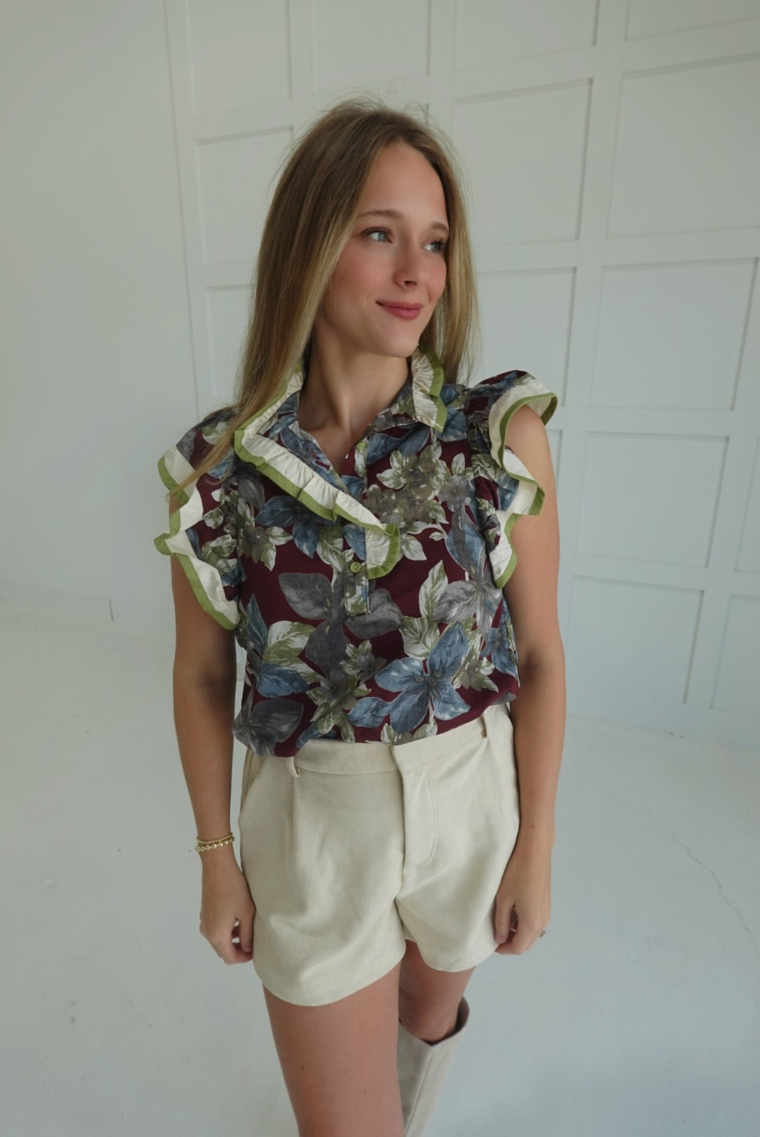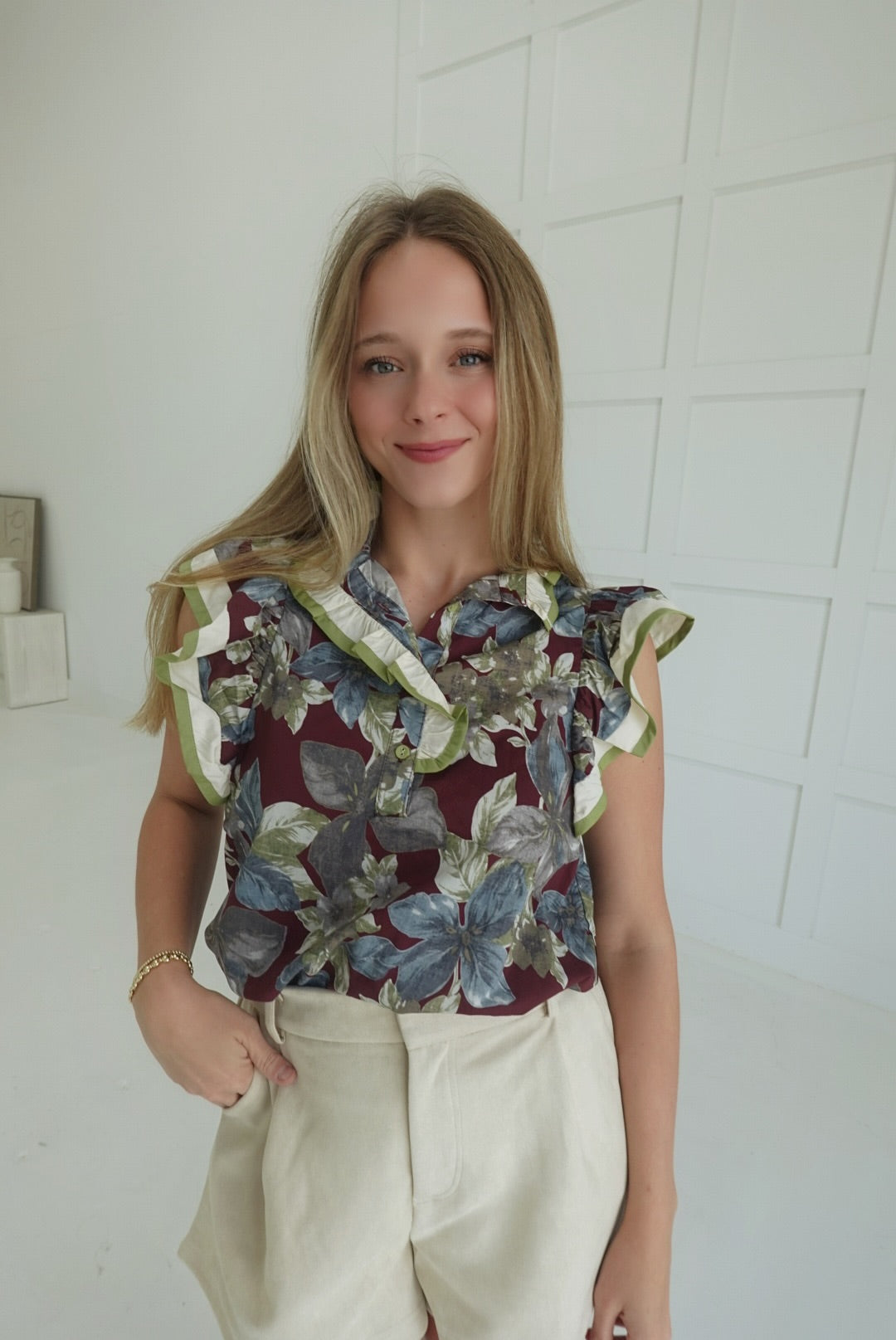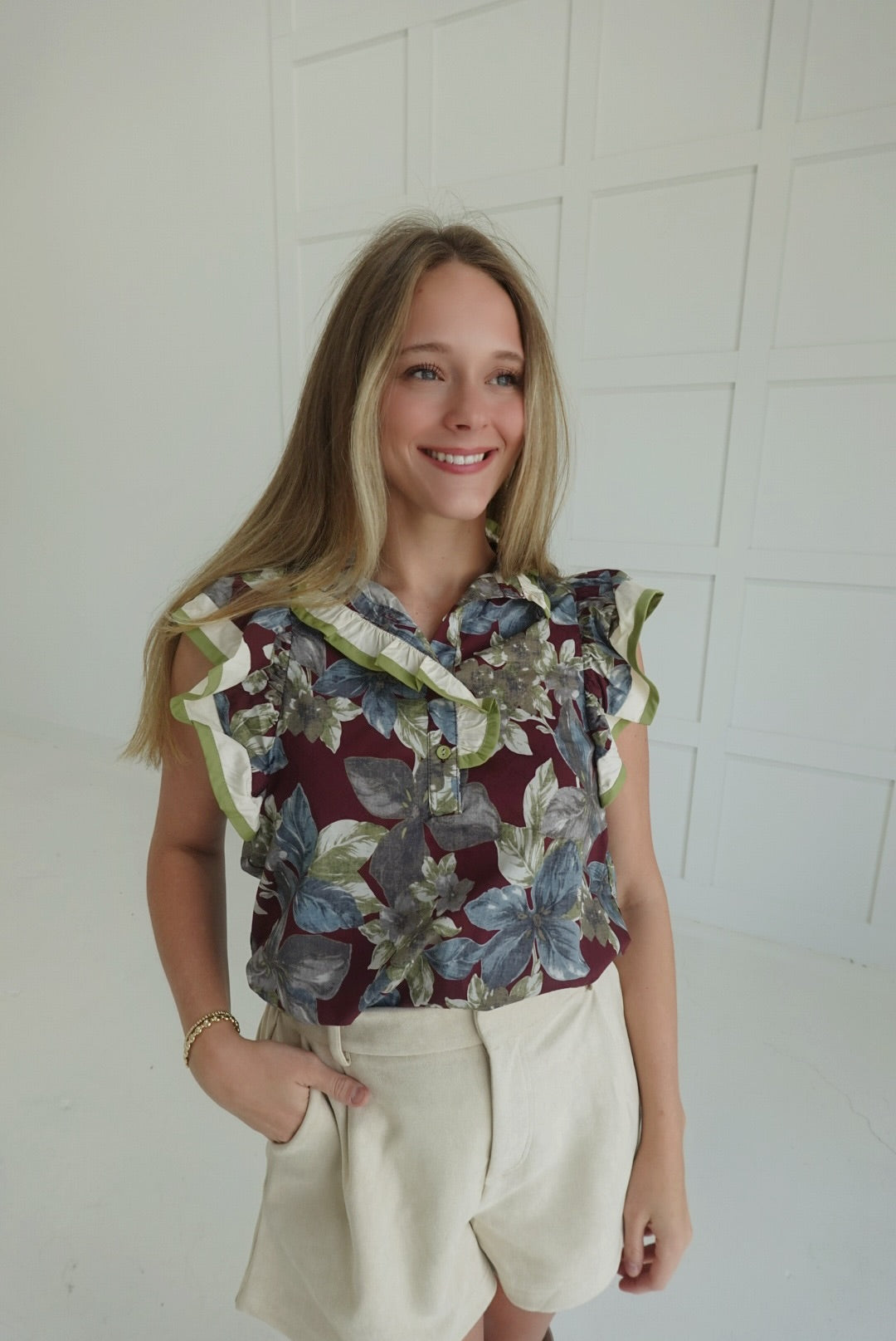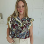 Embrace effortless style with the Vintage Lease Top in Wine This lightweight woven blouse features a vibrant floral print with multicolor contrast accents and delicate ruffle details along the flutter sleeves and band collar. The button-front closure adds a classic touch, while the unlined, non-sheer fabric ensures comfortable wear all day. Perfect for adding a feminine, vintage-inspired flair to your wardrobe.