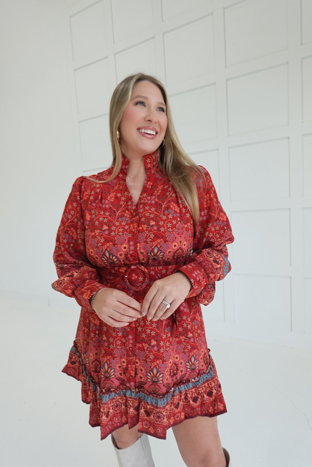 Embrace effortless style with the Wine and Wildflowers Mini Dress, featuring a charming border print and a flattering button-front design. The self belt cinches at the waist to enhance your silhouette, making it a perfect choice for both casual outings and special occasions. Its light, breezy fabric ensures comfort all day long while keeping you confidently chic.