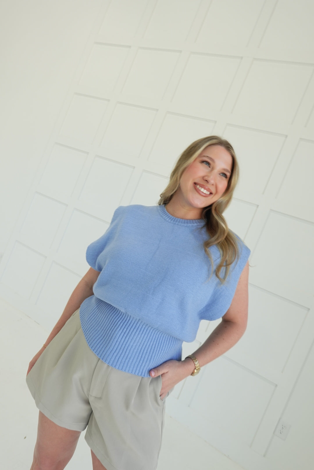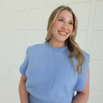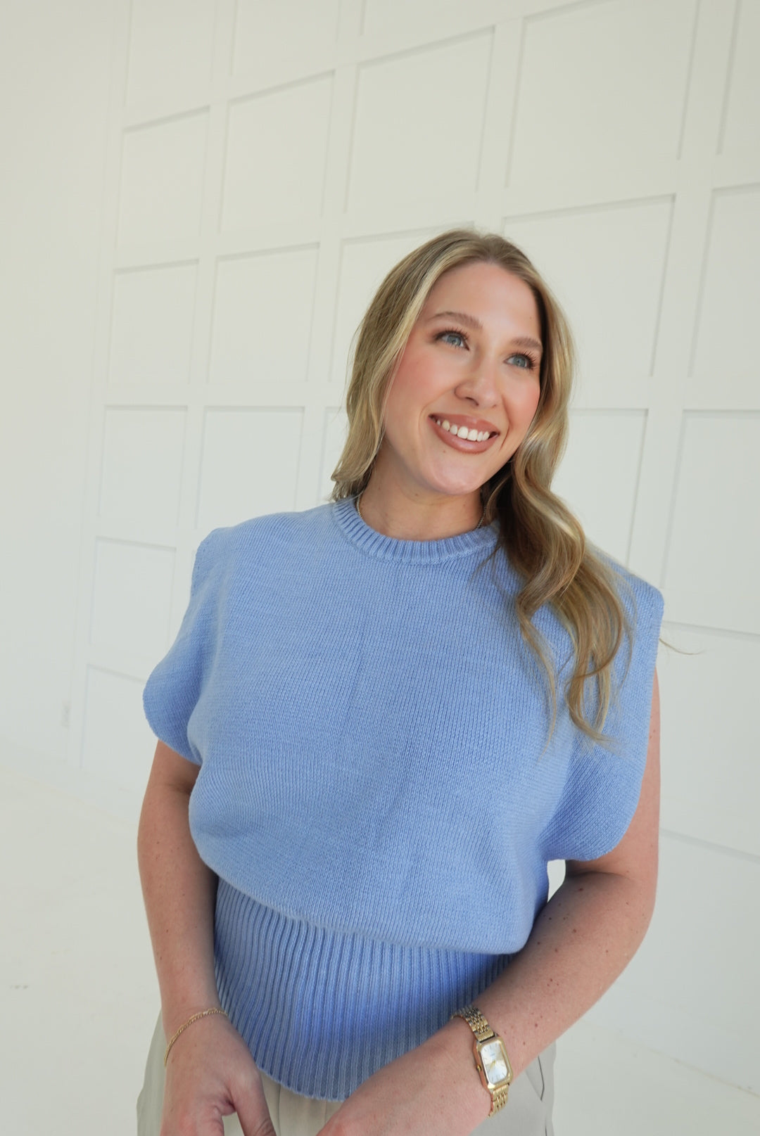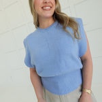 Winter To Spring Top - Dusty Blue Embrace effortless layering with this oversized sweater vest in soft dusty blue. The generously cut armholes deliver unexpected freedom of movement—perfect for pairing over crisp button-ups, fitted tees, or delicate long-sleeves. Transitional enough to carry you from chilly mornings into warmer days, this piece refuses to play it safe. The relaxed silhouette channels modern minimalism with an edge, making it the ultimate wardrobe rebel that works harder than traditional sweaters. Versatile, bold, and unapologetically comfortable.