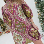 Embrace effortless elegance with this charming mini dress featuring a delicate framed floral print that captures timeless sophistication. The ruffled collar adds a playful touch while the smocked yoke creates flattering definition at the bodice. Fully lined for comfort and confidence, this piece transitions beautifully from casual outings to special occasions. The burgundy mix palette offers versatile styling options that complement any wardrobe. Perfect for those who appreciate feminine details and quality craftsmanship.