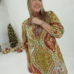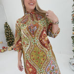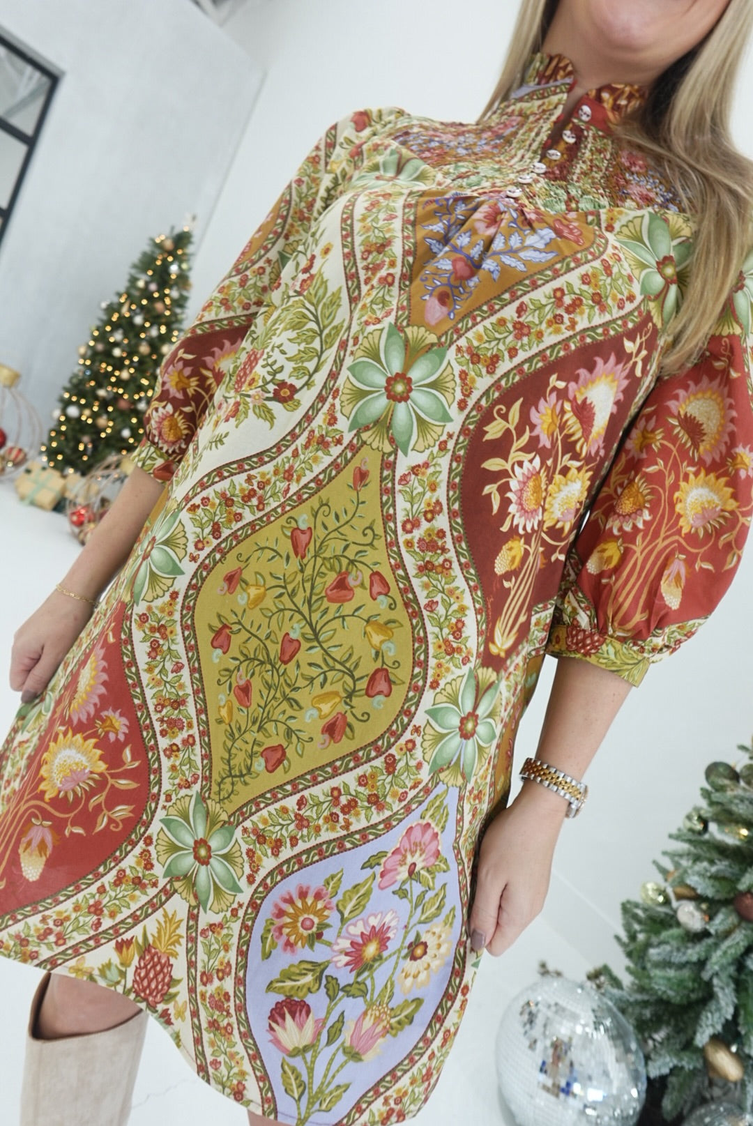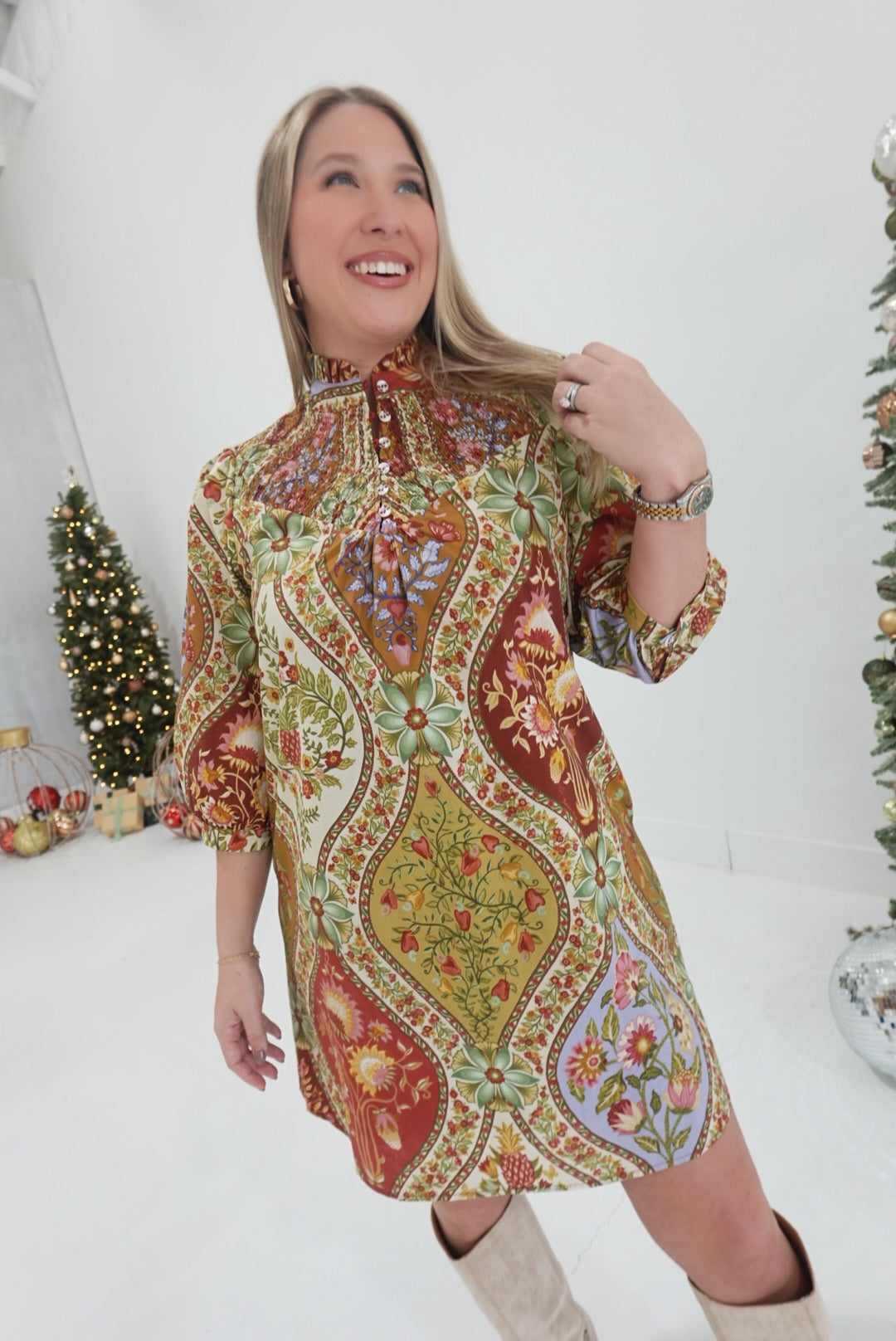 Embrace effortless elegance with this charming mini dress featuring a delicate framed floral print that captures timeless sophistication. The ruffled collar adds a playful touch while the smocked yoke creates flattering definition at the bodice. Fully lined for comfort and confidence, this piece transitions beautifully from casual outings to special occasions. The burgundy mix palette offers versatile styling options that complement any wardrobe. Perfect for those who appreciate feminine details and quality craftsmanship.