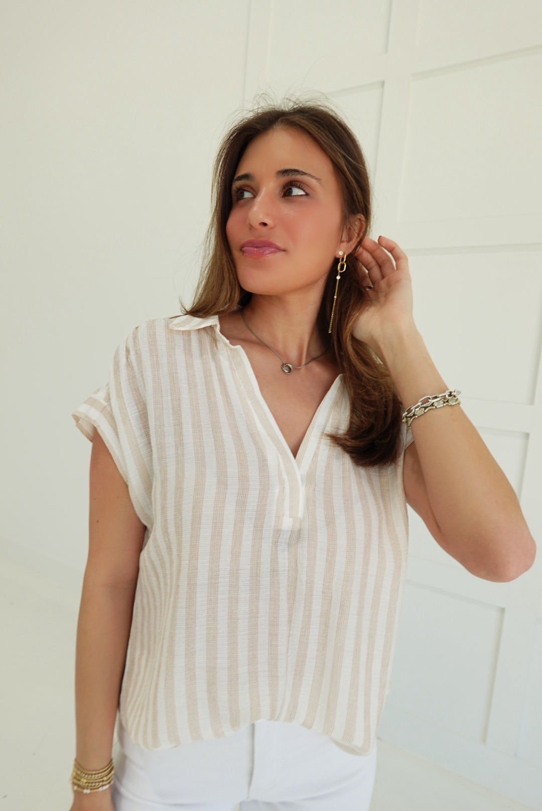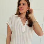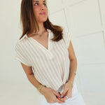 - Striped, Collared, V Neck Short Sleeve Top