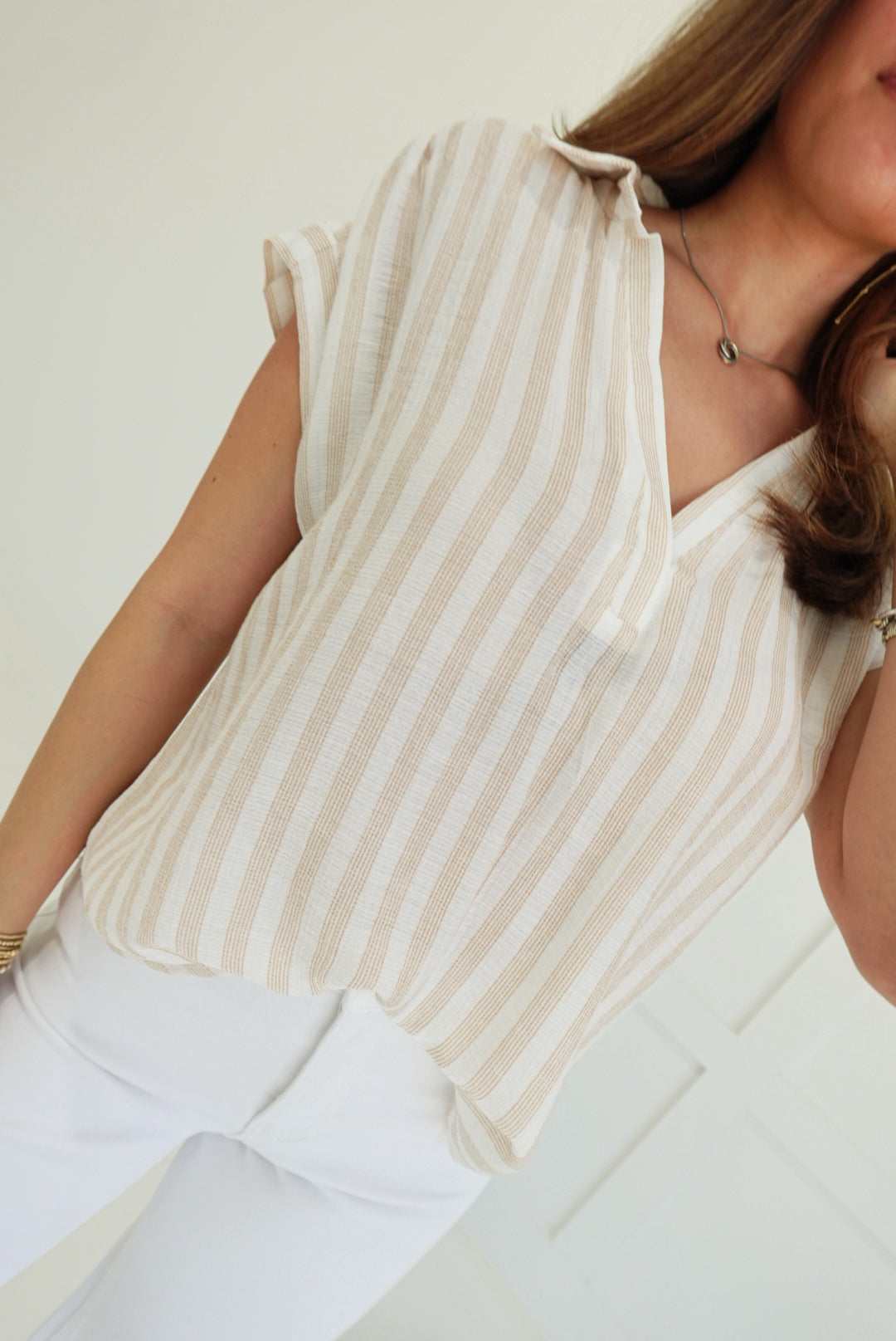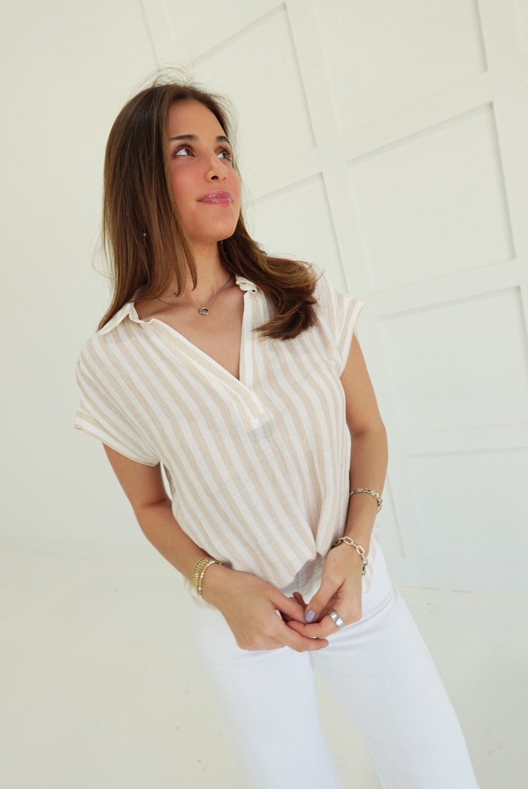 Striped Collared V-Neck Short Sleeve Top Bold vertical stripes command attention on this sharp collared v-neck, cut for a flattering silhouette that transitions seamlessly from office to evening. The structured short sleeves and crisp collar deliver polished edge, while the breathable fabric keeps you cool and confident. A daring choice for anyone ready to stand out with understated sophistication.